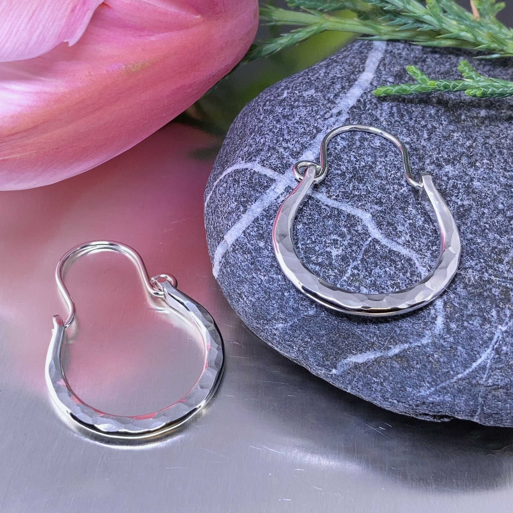 A little bit of interest added to the standard hoop earring. This earring has a hammered texture round hoop with a stirrup shape to the top ear wire. This pair is particularly substantial – I used a heavy wire to make these earrings.
