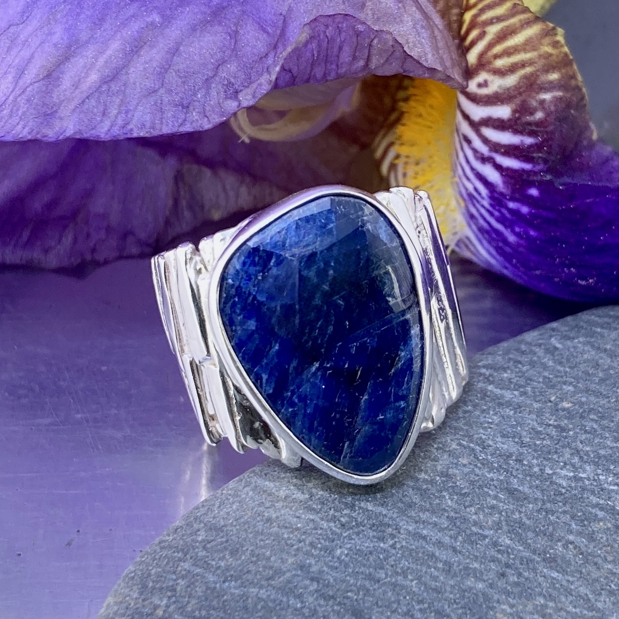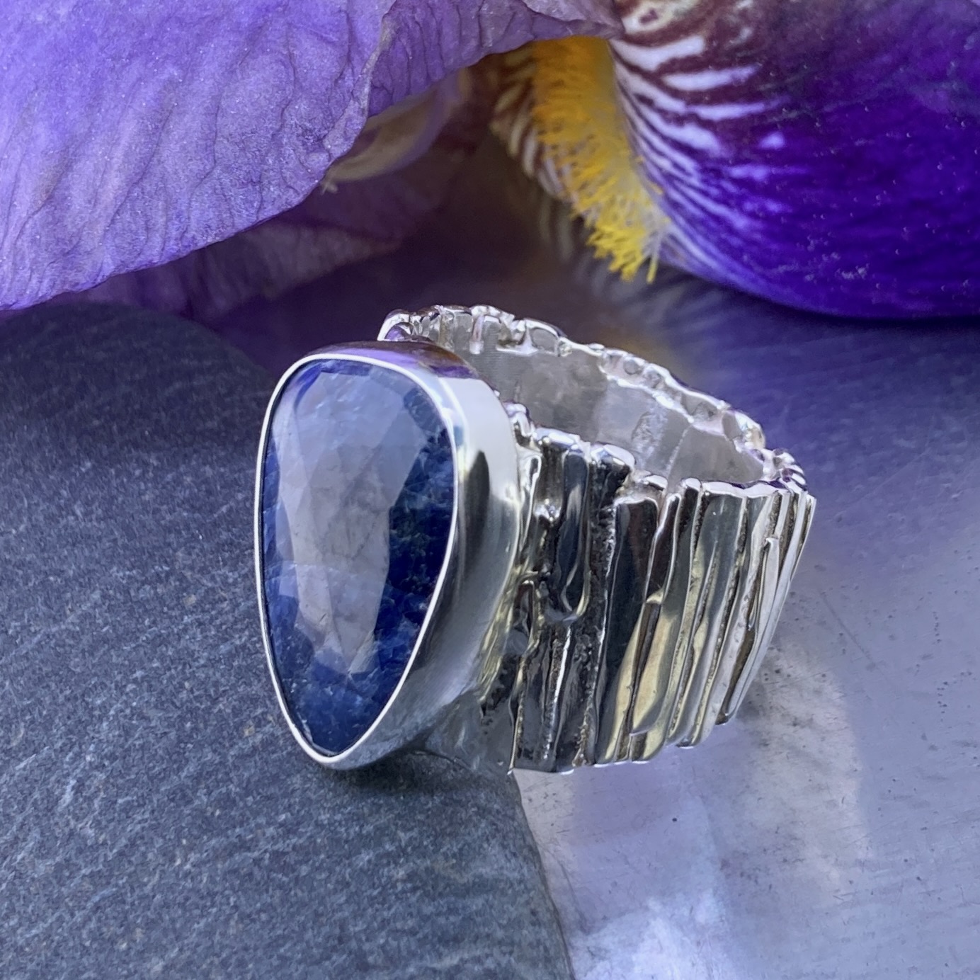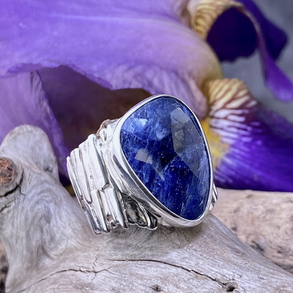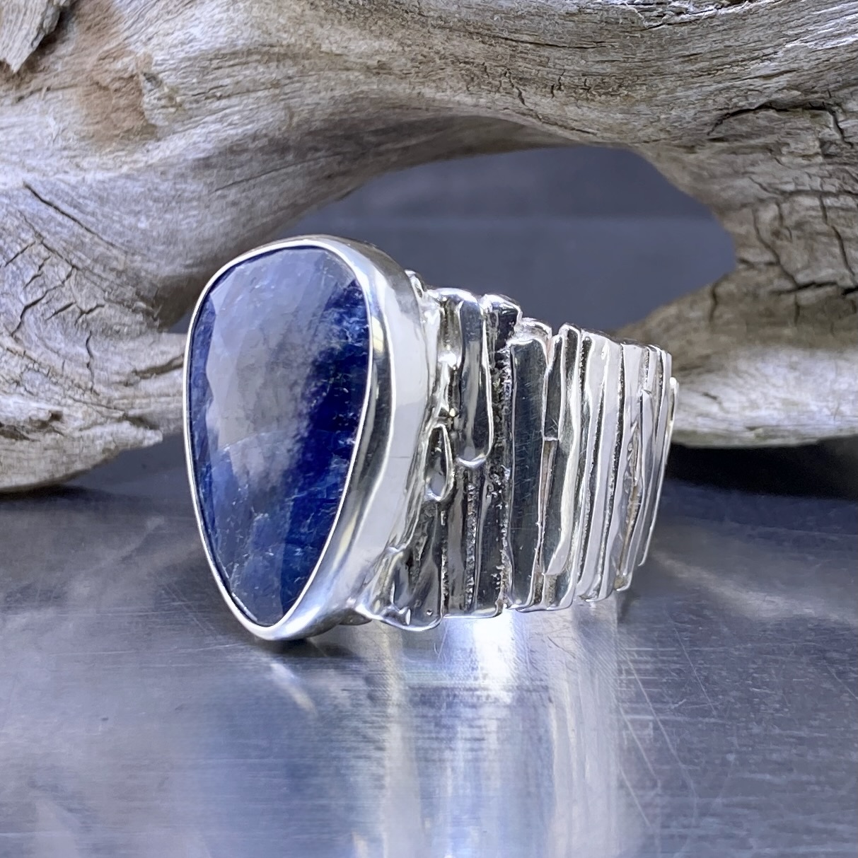 I begin with thick Argentium sheet and fuse it under heat, building the bark texture by hand. Once the vertical grain takes shape, I form and polish the band to reveal contrast between high shine and deep recesses. The Sapphire is then bezel set to complete the design.