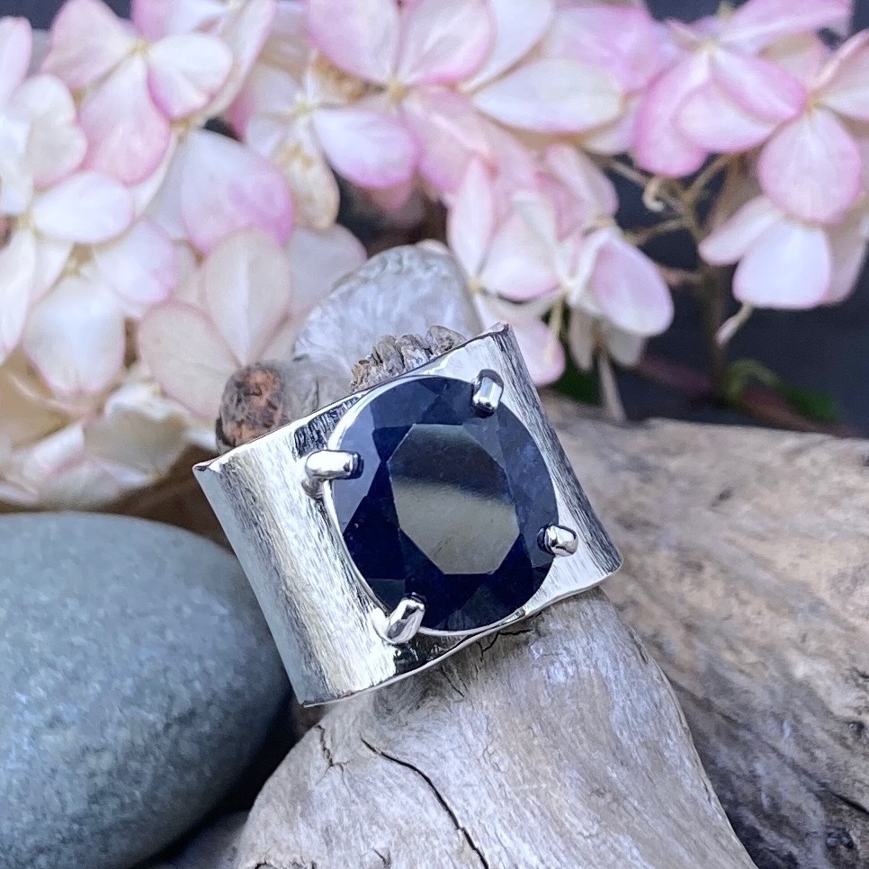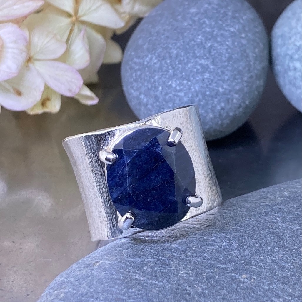 Sapphire Ring – Size 9 – Argentium Silver Wide Band – 10.5 Carat