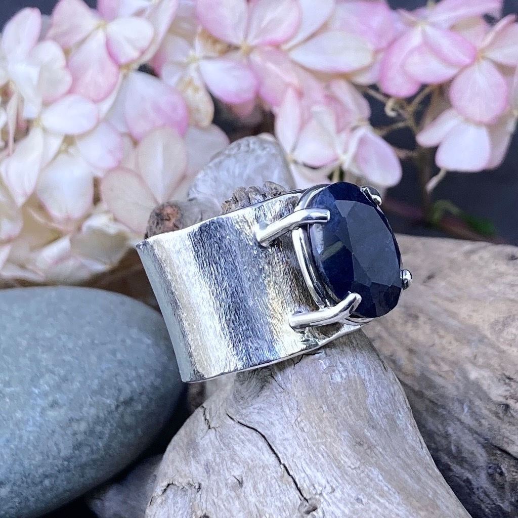 This Sapphire ring reveals the raw beauty of stone and silver in a bold, wide-band design.