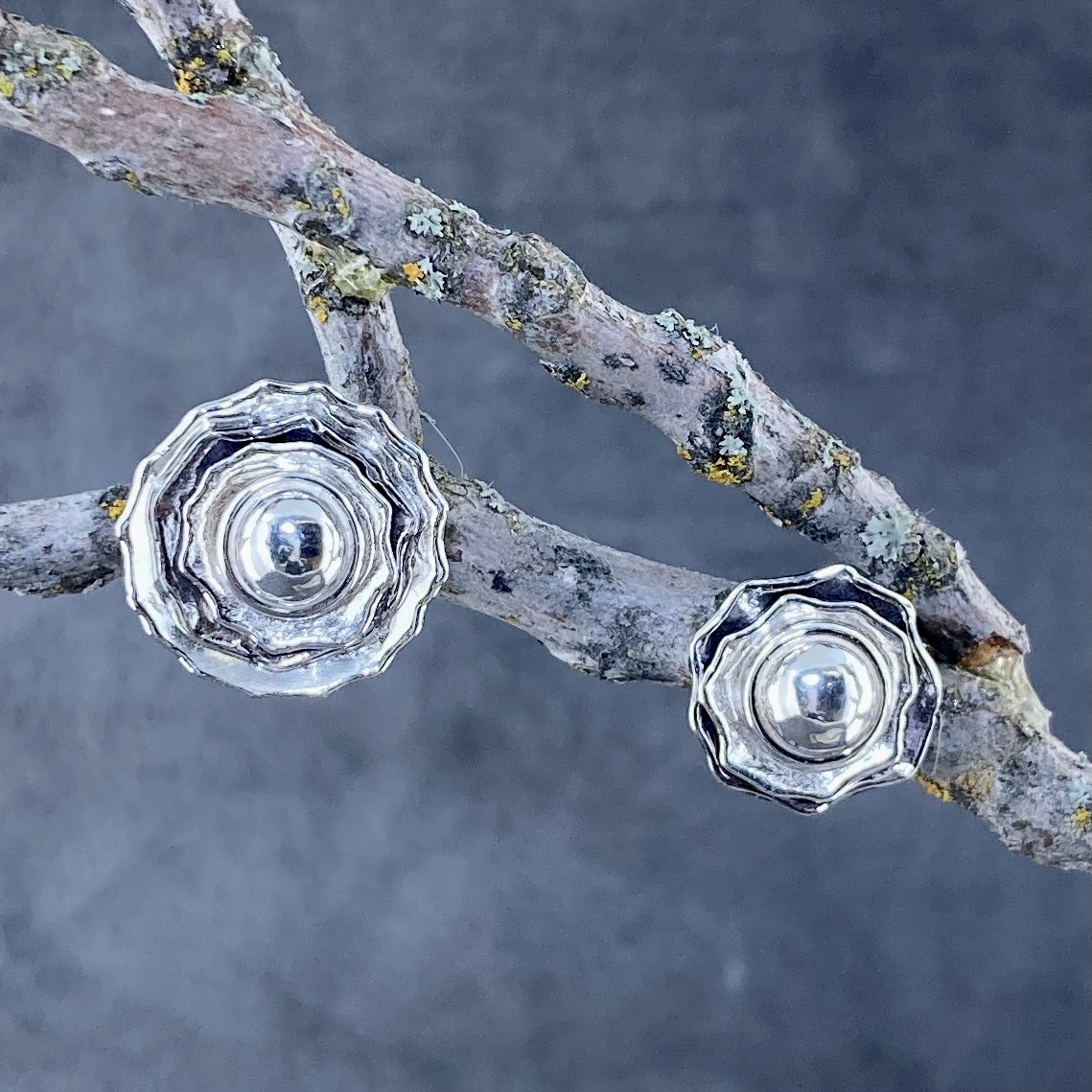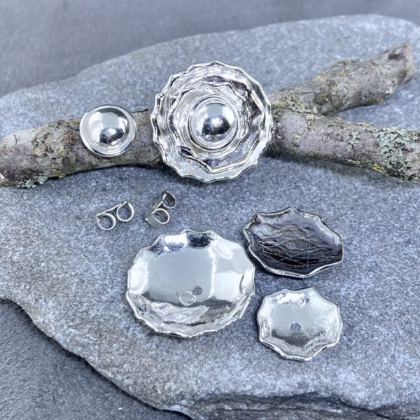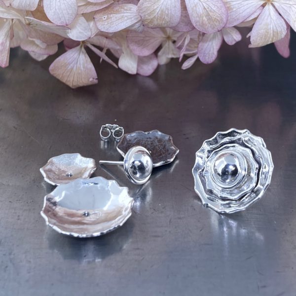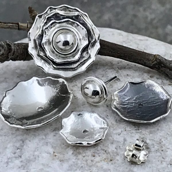 These are 5 part earrings – the post and the butterfly – with their optional flower petals to layer on. The middle size petal is antiqued to add dimension – all are solid Argentium silver that I gently melted to create a soft flowing edge.