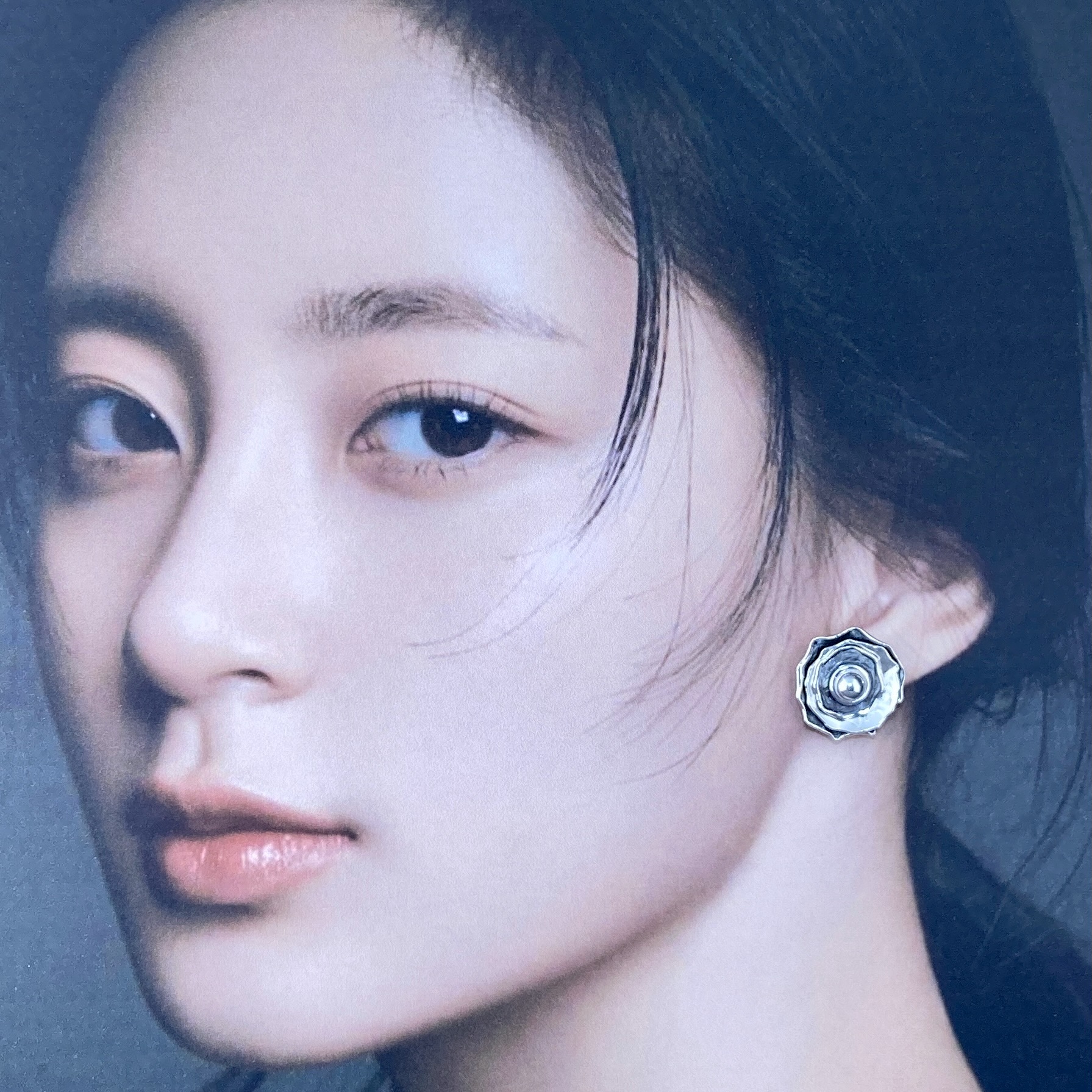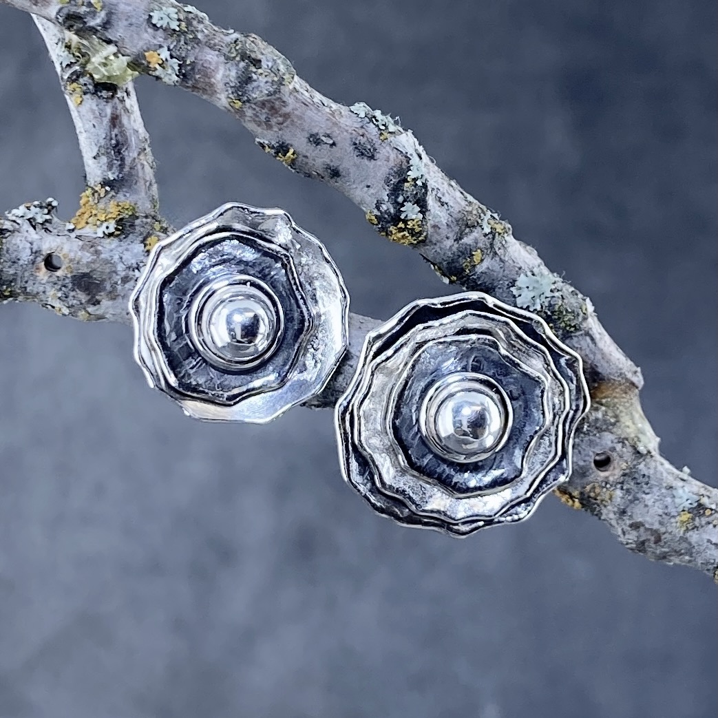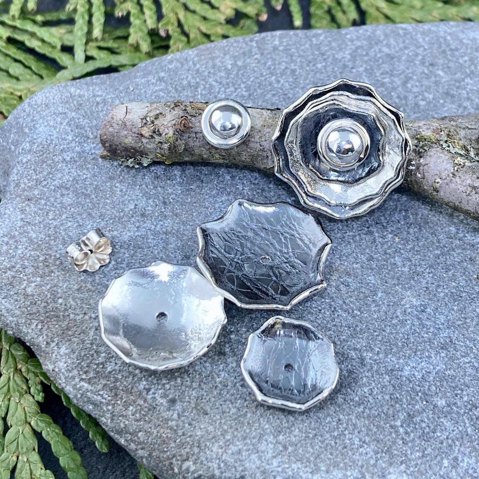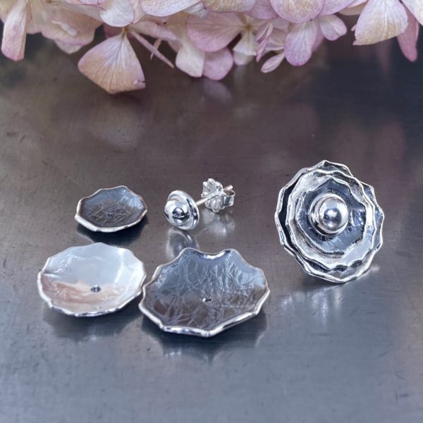 Argentium silver blossom earrings – The petals can be worn all together to create a layered flower, or the post by itself so no flower at all – just a nice granule earring – and any combination in-between. This earring has 3 Argentium silver petals with a large granule post.
