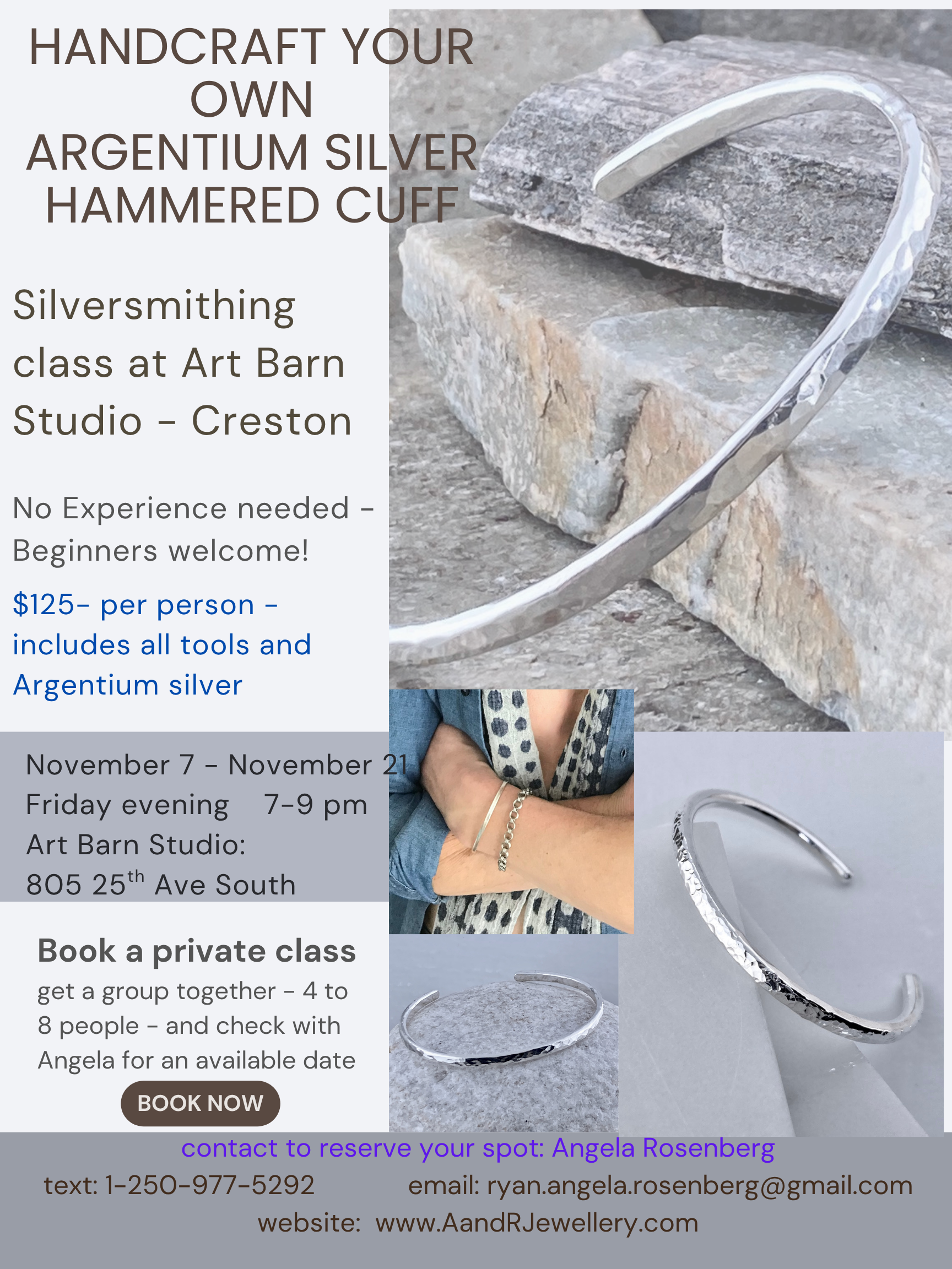 Class begins with a short safety overview, then moves through each step: find your size→ measure and cut → anneal → planish or texture → shape on mandrel → finish and polish. Students complete both a copper practice cuff and a finished Argentium silver cuff.