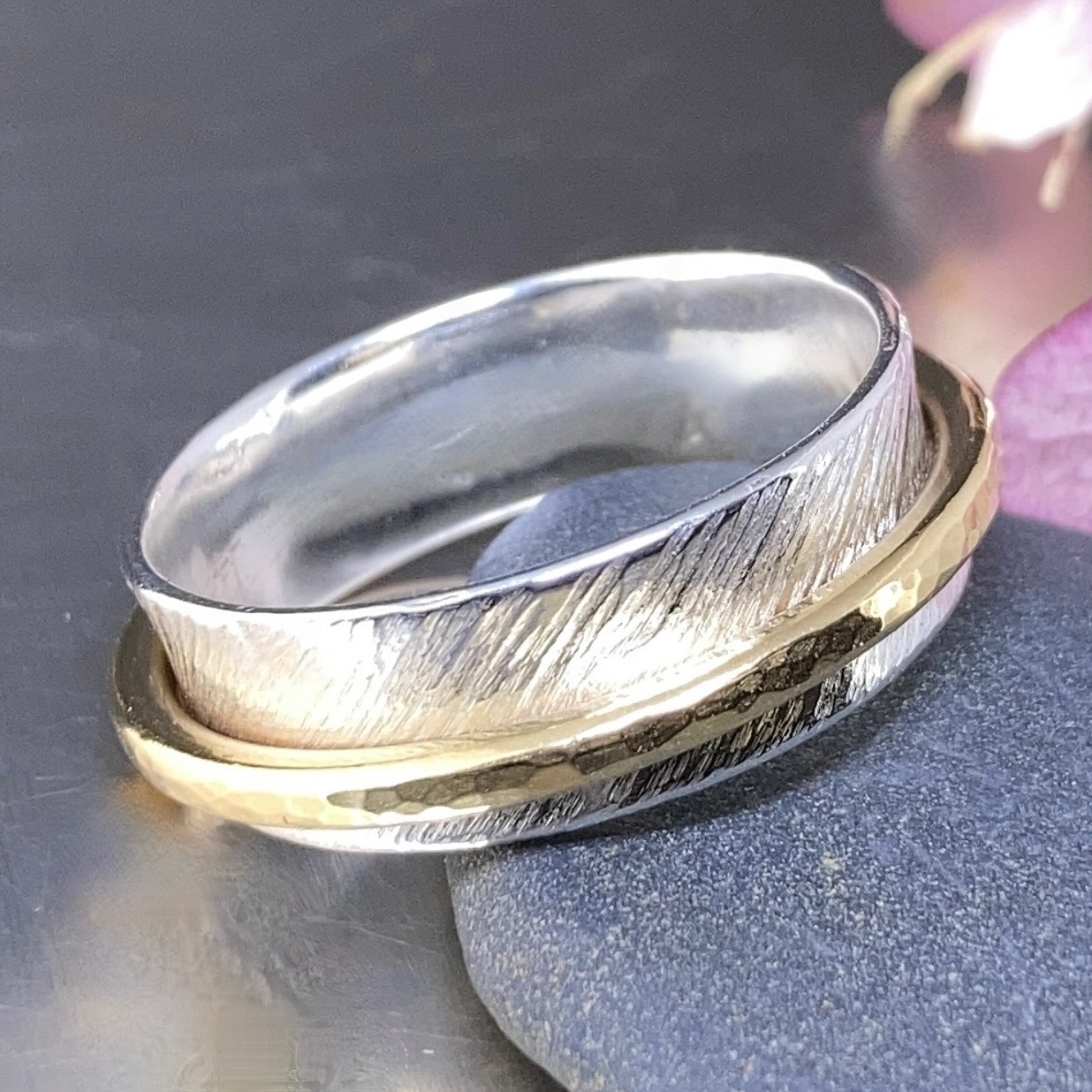 • Project: Argentium Silver base ring with your choice of Brass, Copper, or Silver spinner bands.