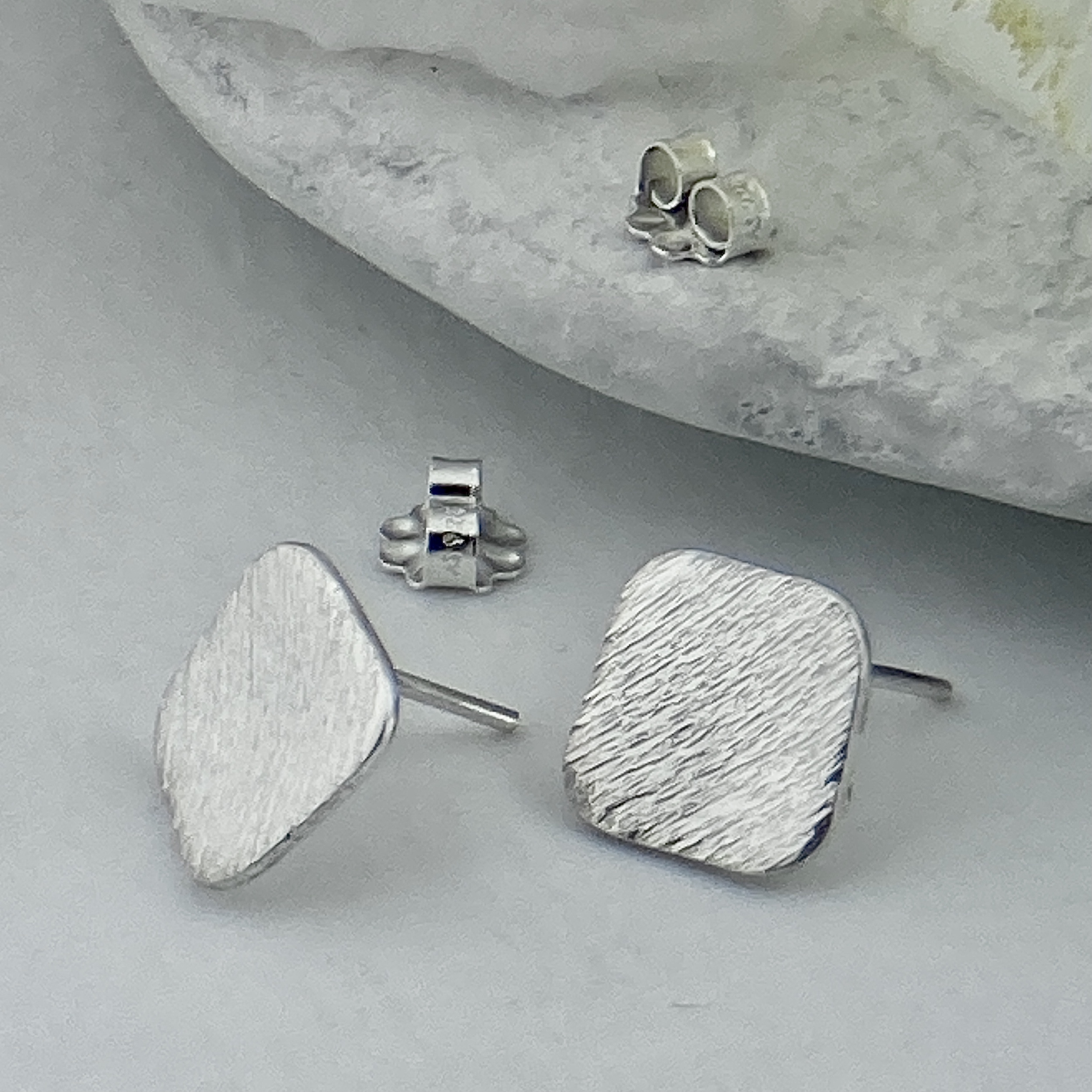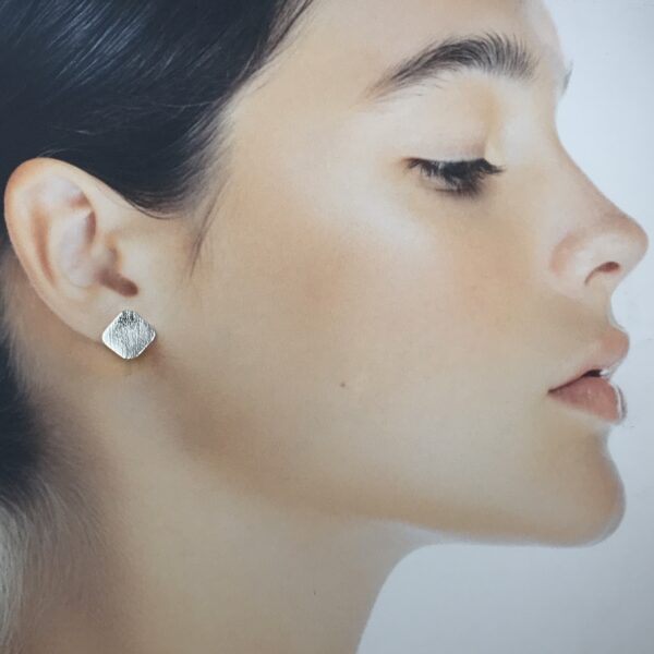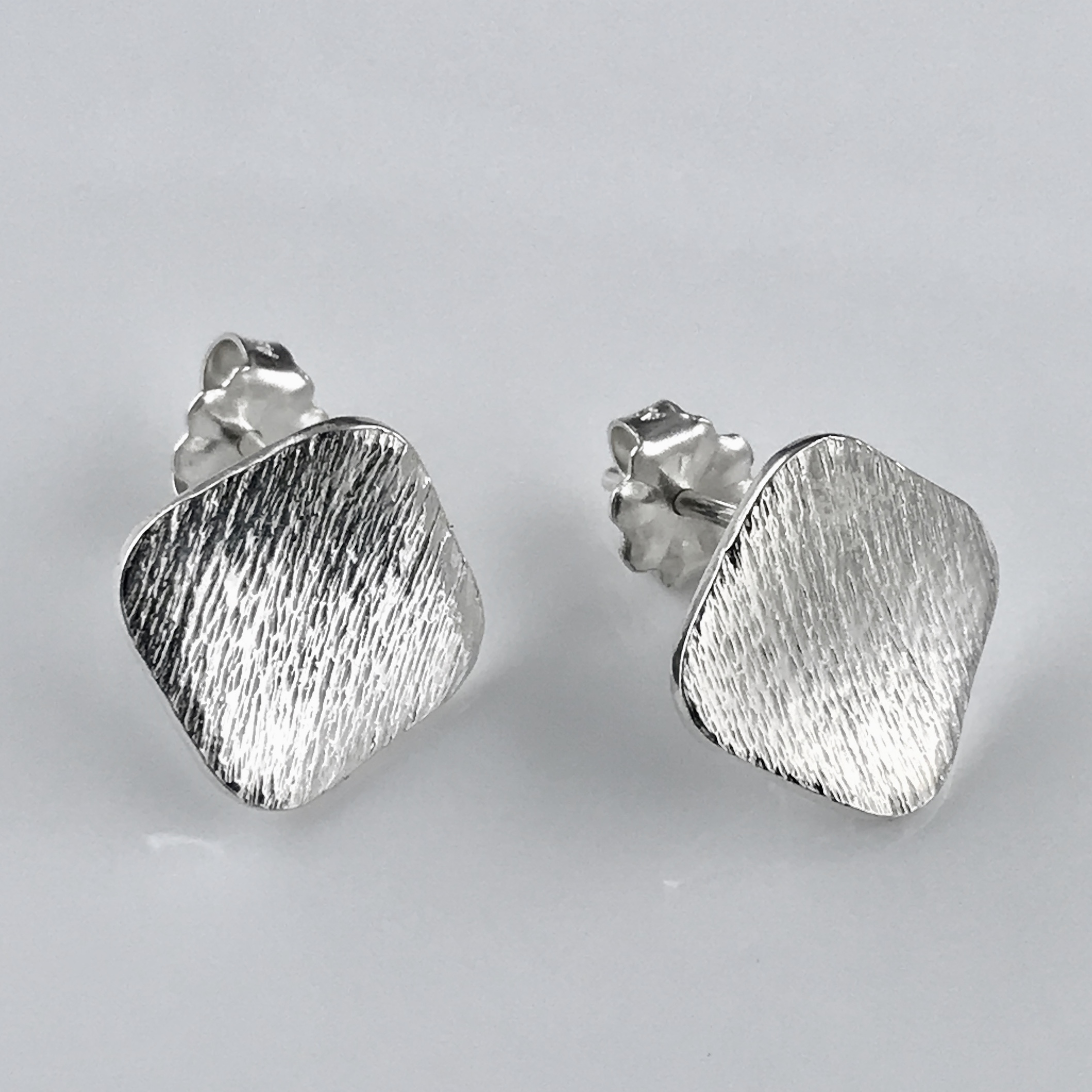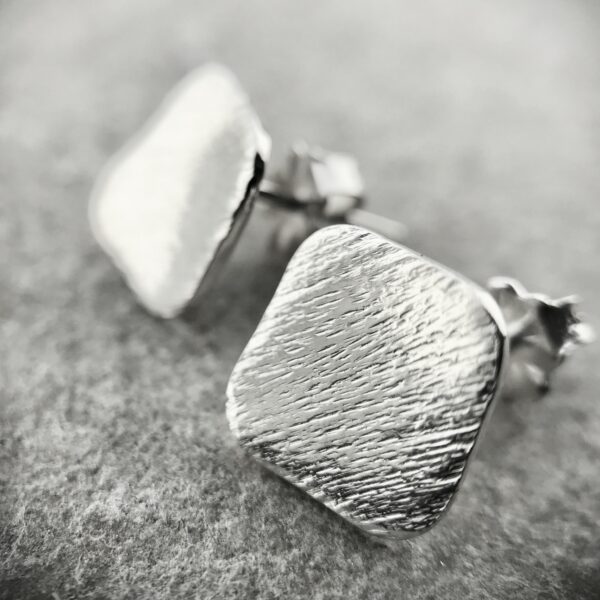 Only one size of this design – because it is the perfect size. I have linear etched the surface of this little Argentium silver square – cupped it a bit and soldered on a post.