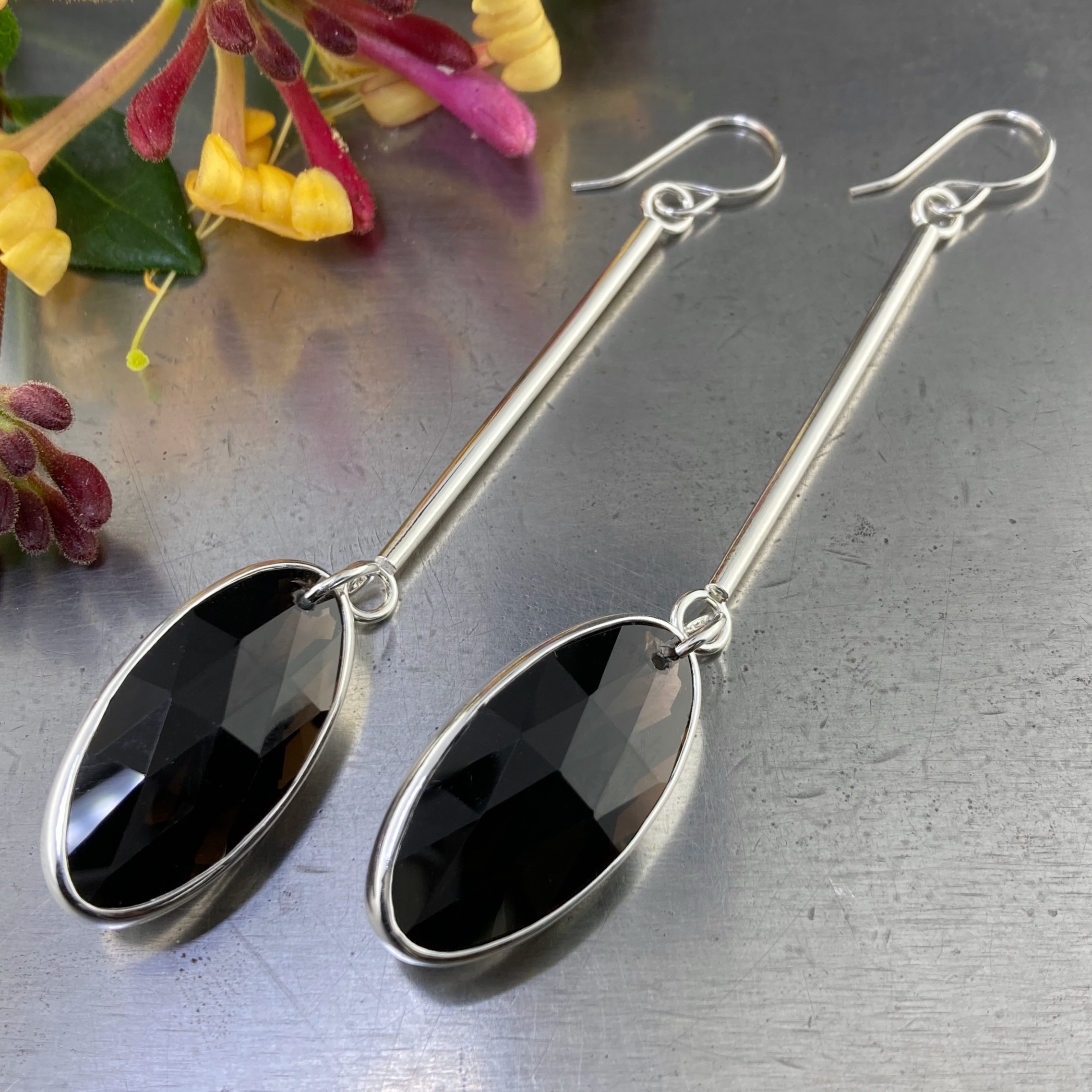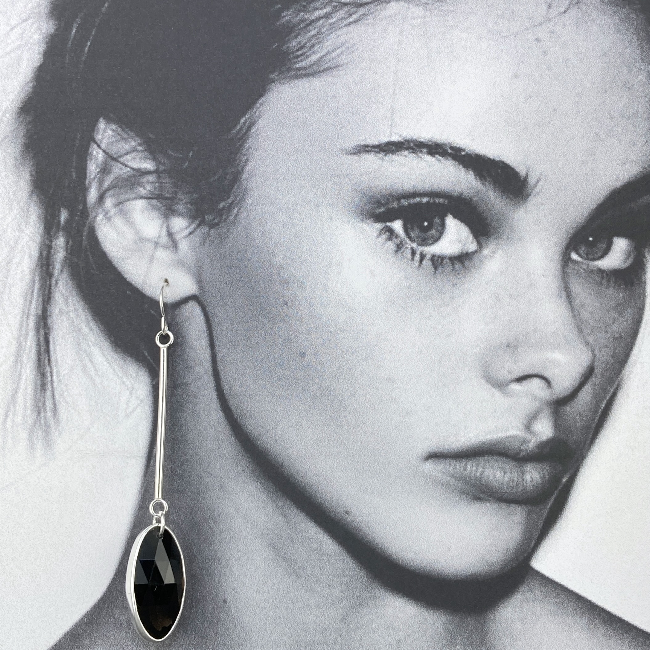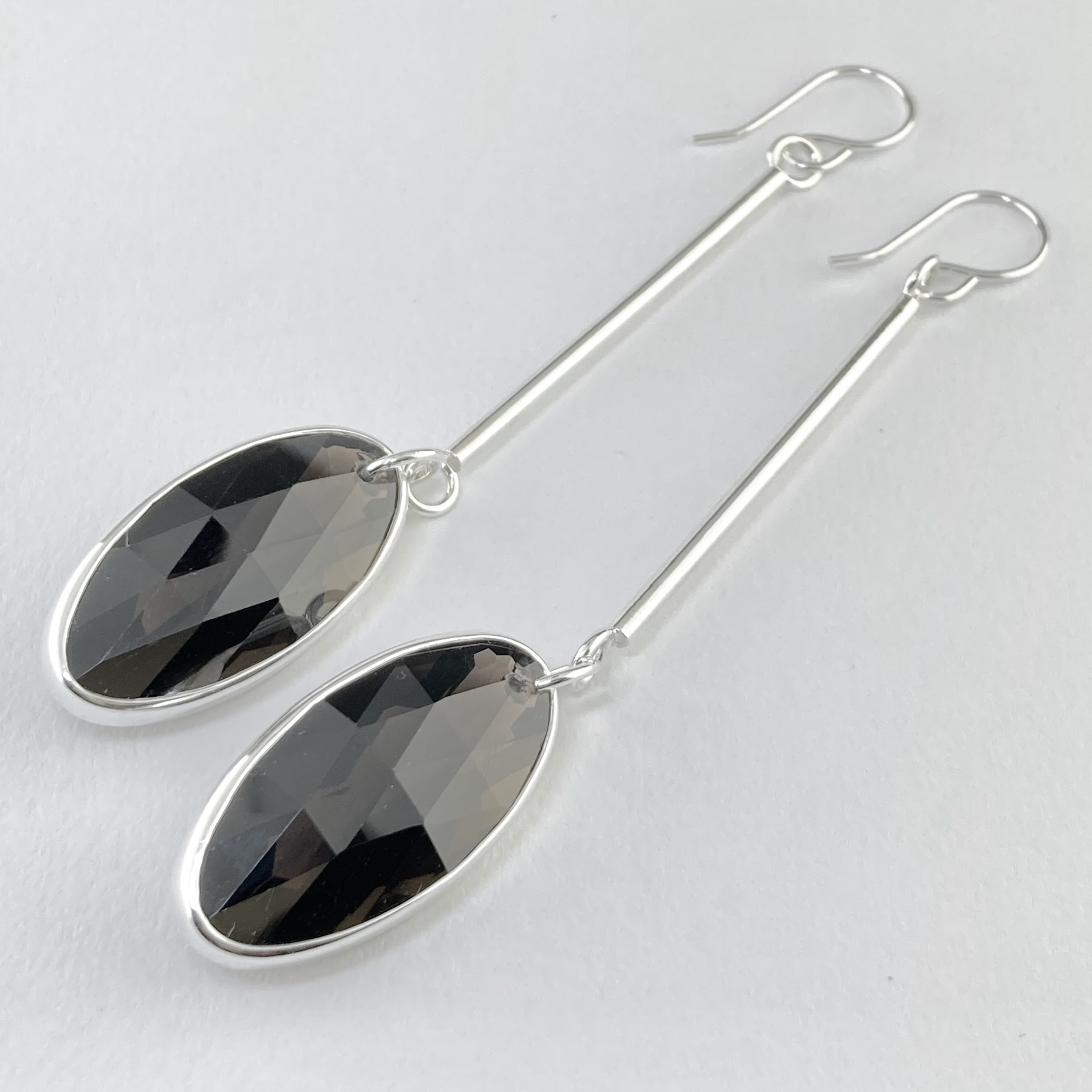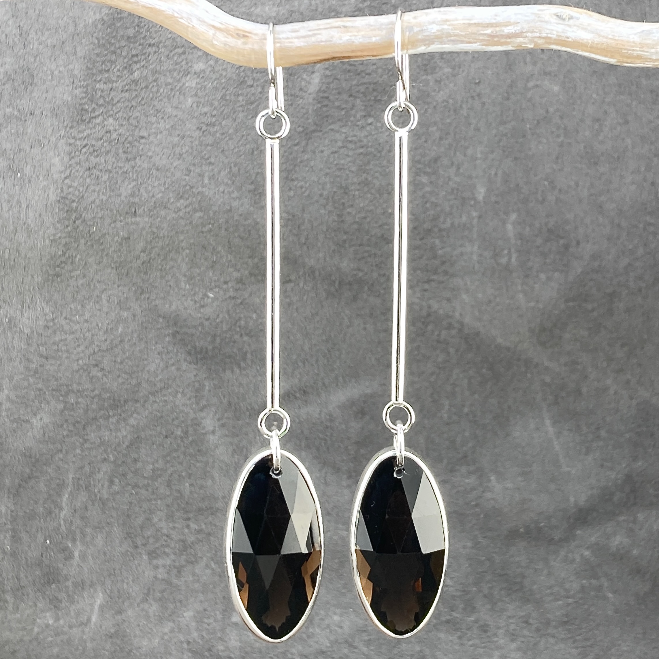 These beautiful earrings are 44.4 carat, oval cut, smoky quartz.  The earring design is a long shiny bar with the Smoky Quartz in a bezel setting. The Smoky Quartz is an African stone with an IF rating (Internally Flawless)