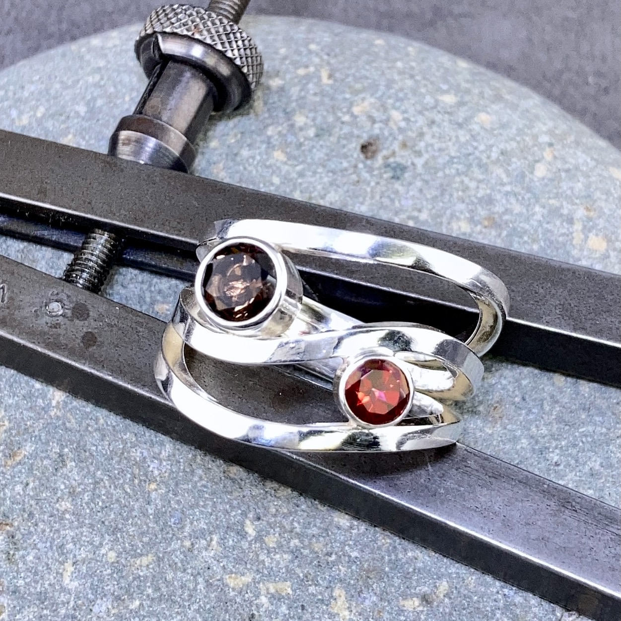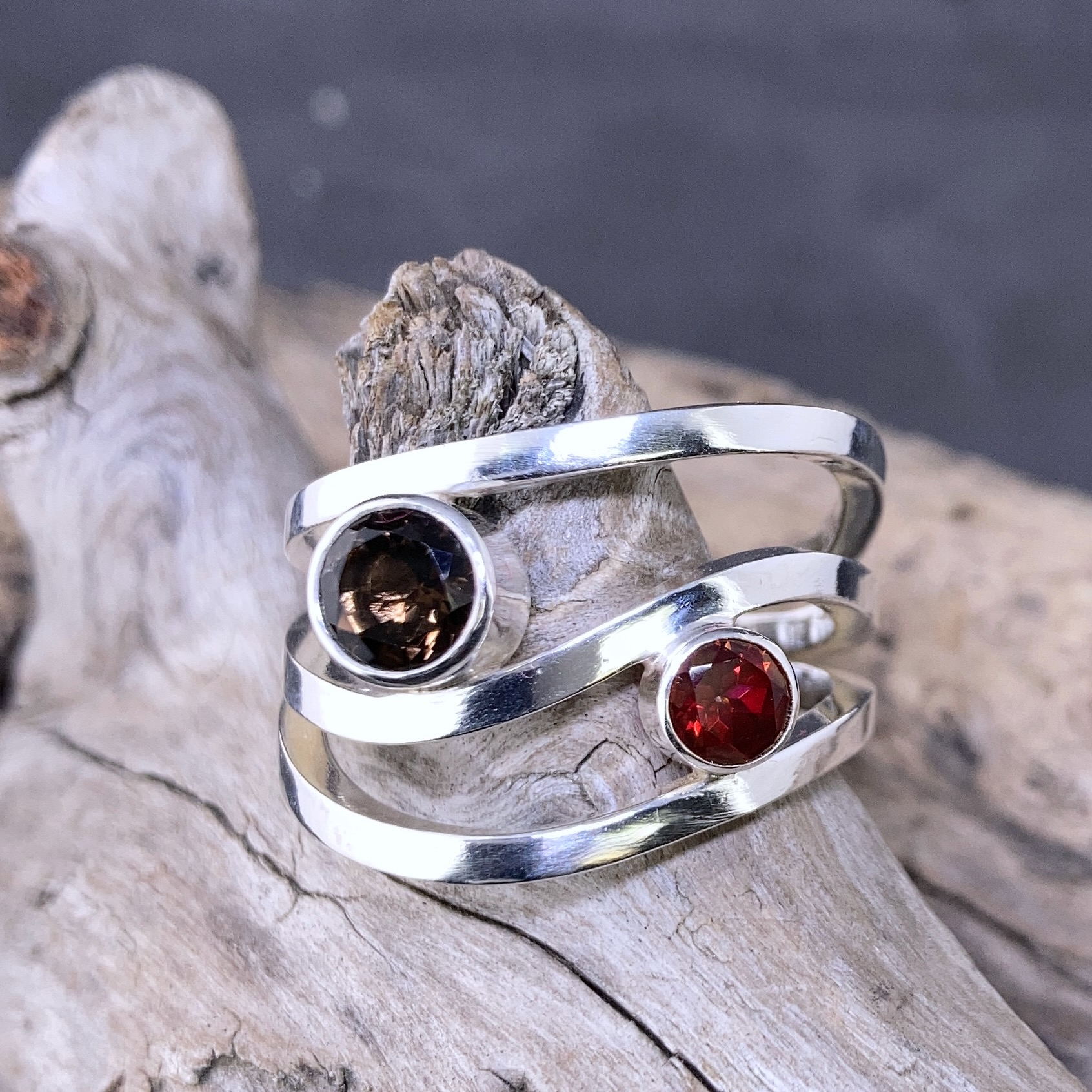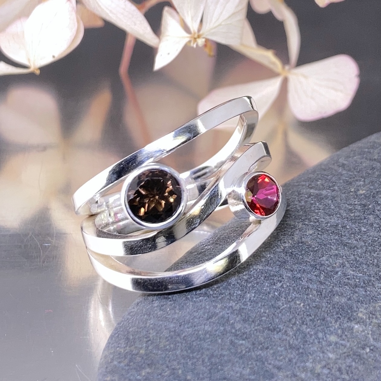 A flowing Wind Band ring made from ribbons of Argentium silver shaped as if caught in a breeze. The movement of the silver gives the ring an airy, sculptural feel. Two accent gemstones — a 1 carat Smoky Quartz and a 0.5 carat Red Topaz — bring contrast and color to the design.