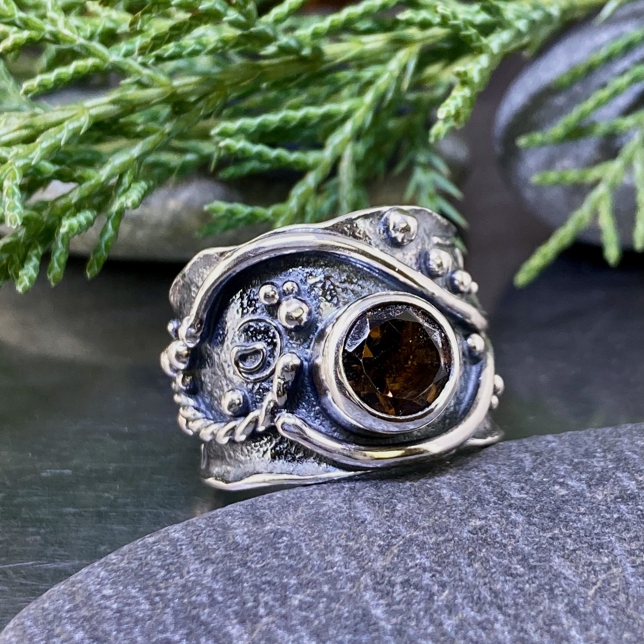 The gemstone is a natural 2 carat Smoky Quartz with a dark brown tone and brilliant cut. It catches light in warm flashes and pairs beautifully with the bright silver band. The bezel setting secures the stone while keeping the design clean and modern.