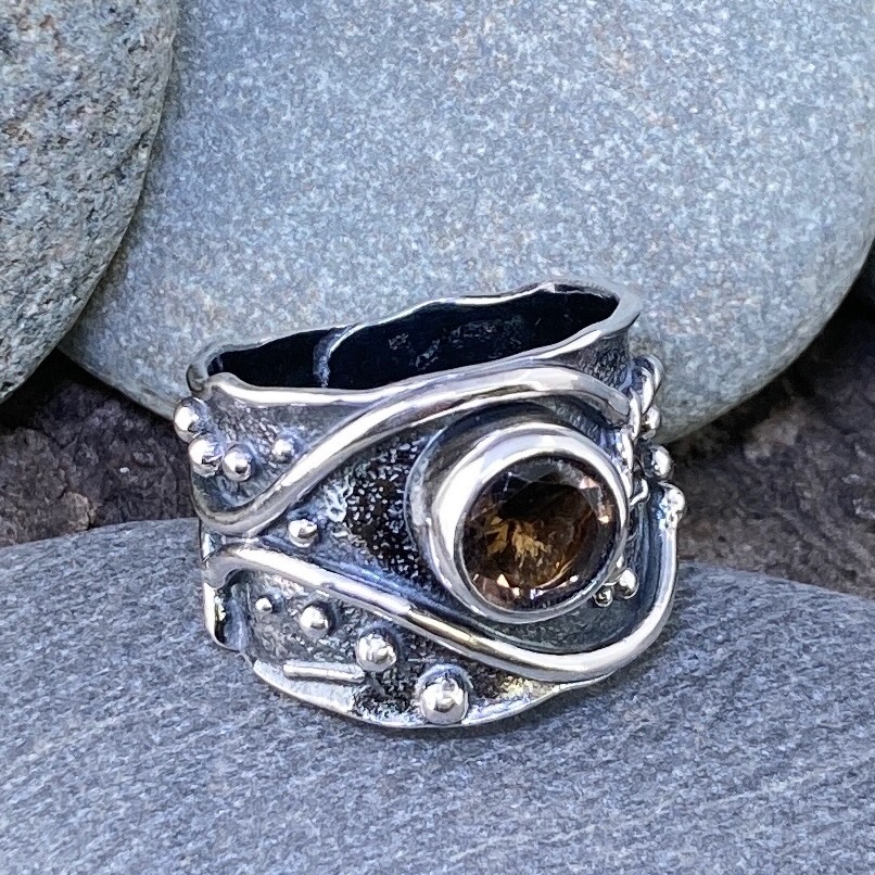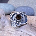 The Smoky Quartz ring flows with quiet strength and balance. Its smooth silver curves hold a rich, dark gemstone that feels calm and grounded, like still water under moonlight. Each ring is handmade with care for an easy, natural fit.