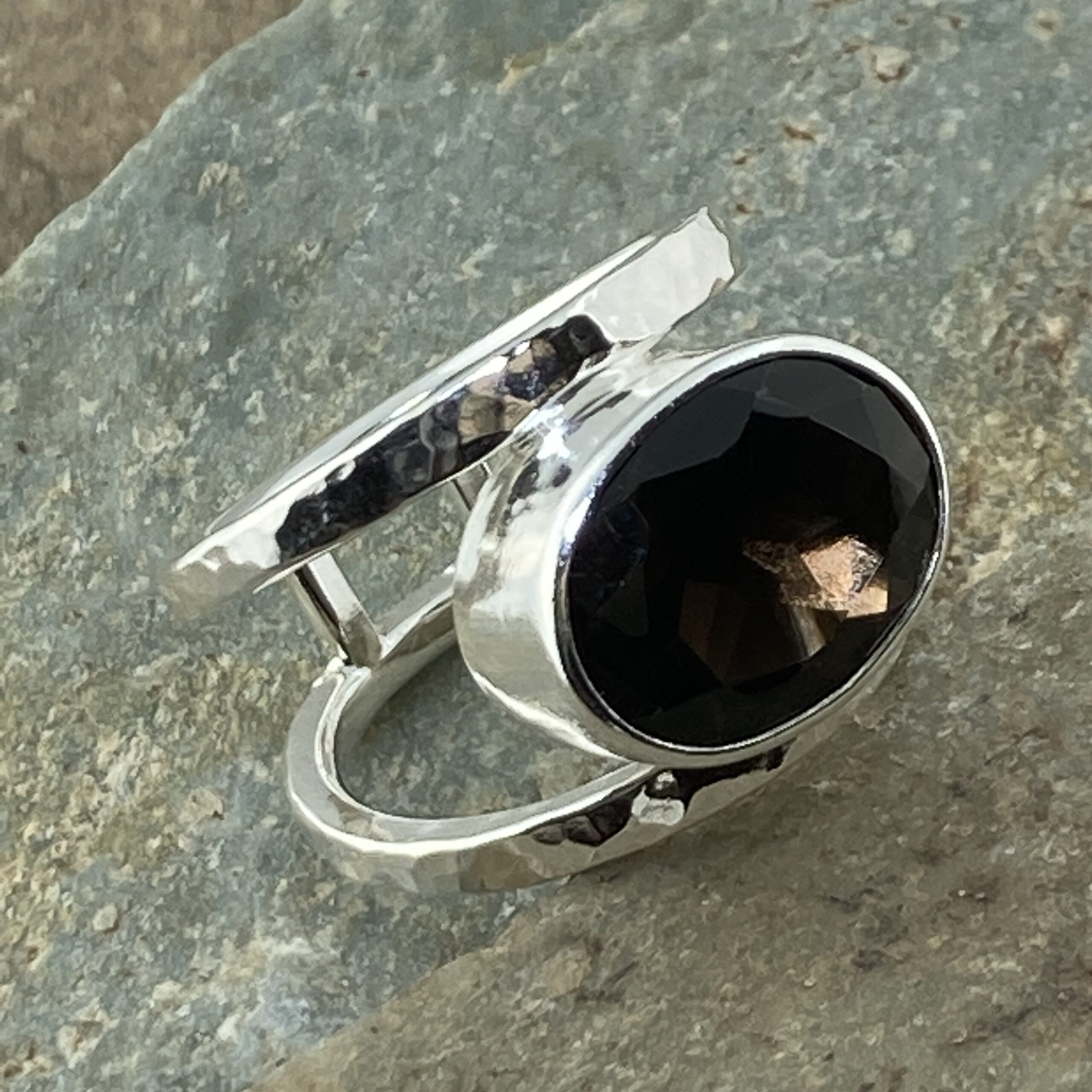 Handmade Smoky Quartz ring in Argentium silver with a Double Band design. Oval gemstone set in a polished, lightly hammered band.