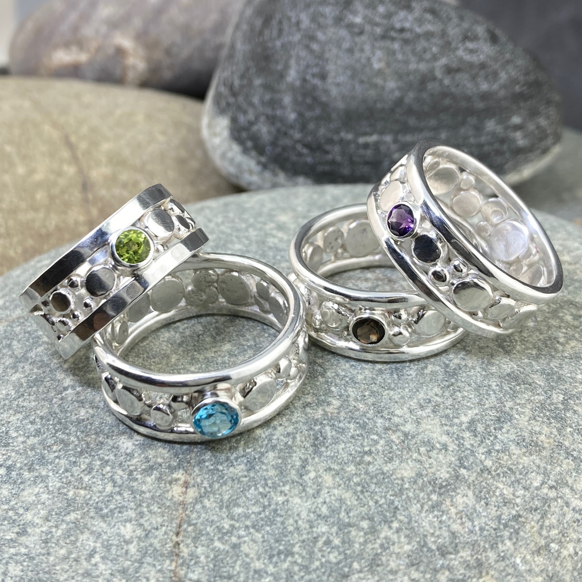 I begin by fusing small pieces of Argentium silver to create granules, flattening and arranging them into an even pattern. After shaping and refining the band, I set the Smoky Quartz into a low bezel for strength and ease of wear. The finished ring is earthy, solid, and perfectly suited for everyday life.