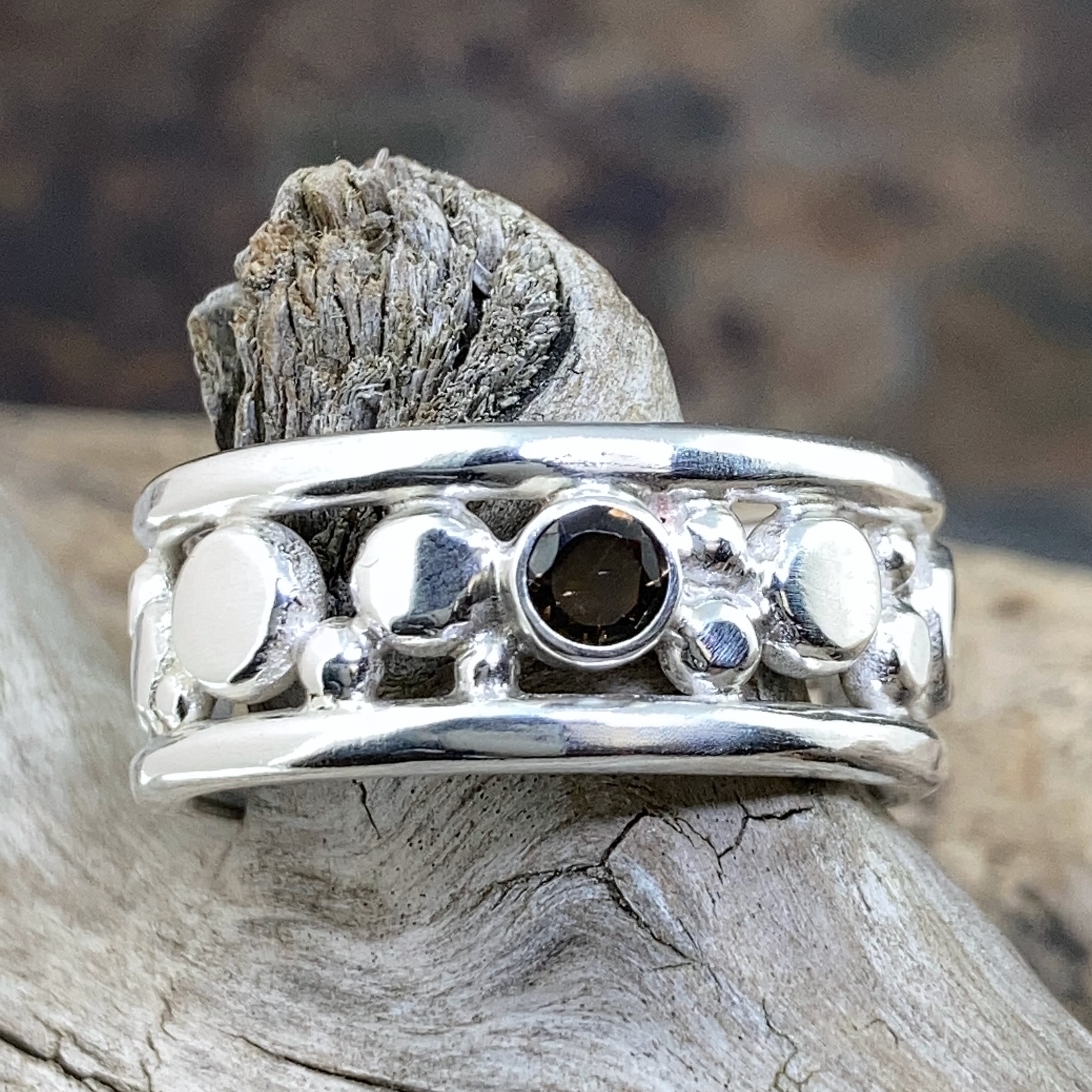 This Smoky Quartz Flat Granules ring blends grounded texture with everyday comfort. The soft bronze hue of the stone rests among flattened silver granules, giving the piece a calm, natural rhythm.