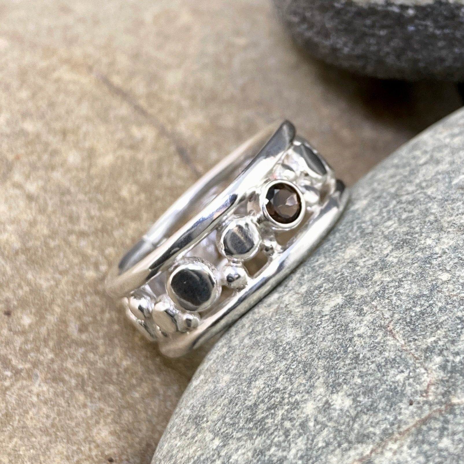 Handmade Smoky Quartz ring in Argentium silver with a Flat Granules band. Bezel set gemstone in a natural, comfortable design.