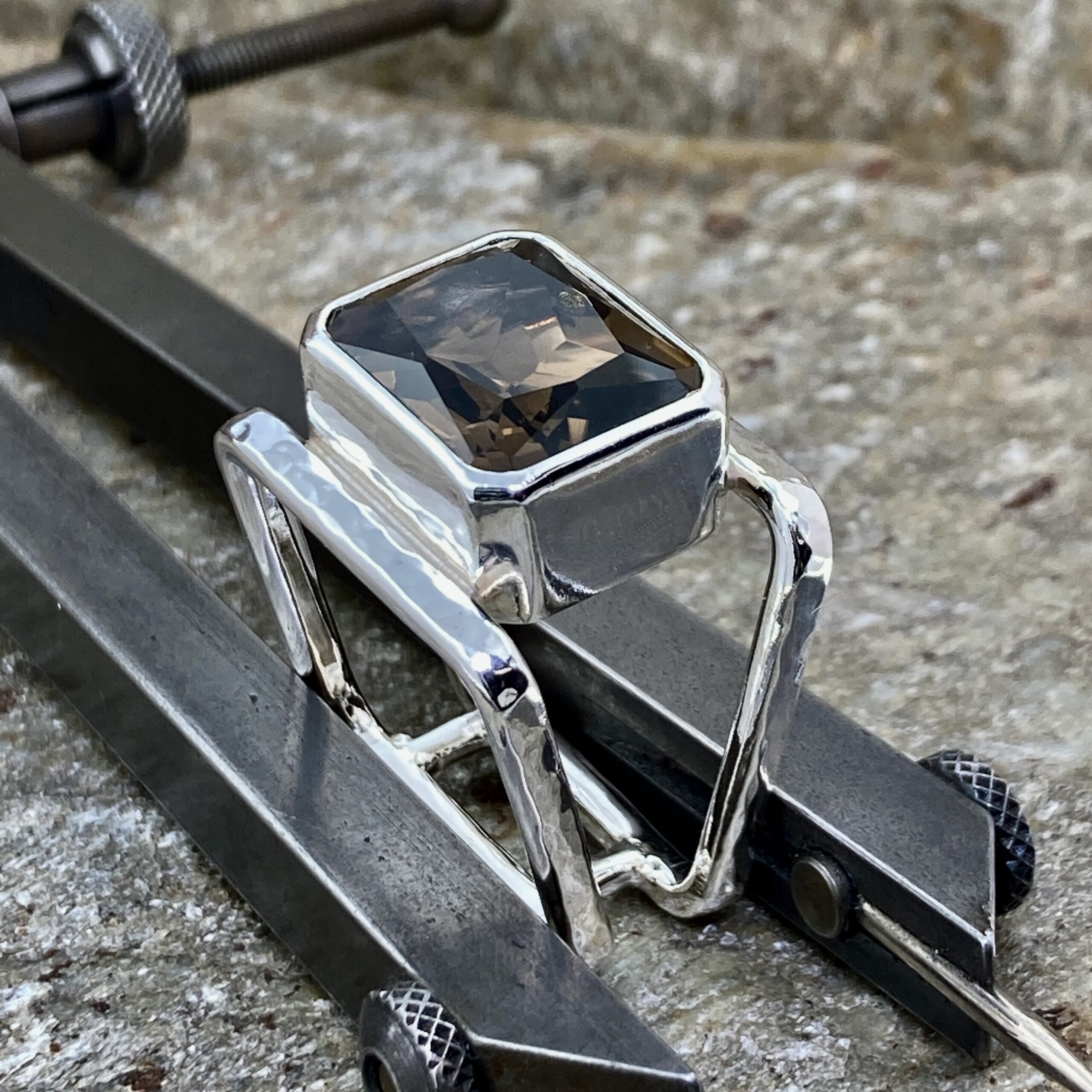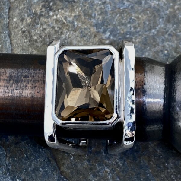 This is a double-band design ring in a square shape.  With a hand-hammered texture.  Tucked between the two Argentium silver bands is a 14.5 carat natural Smoky Quartz, in a rectangle cut.