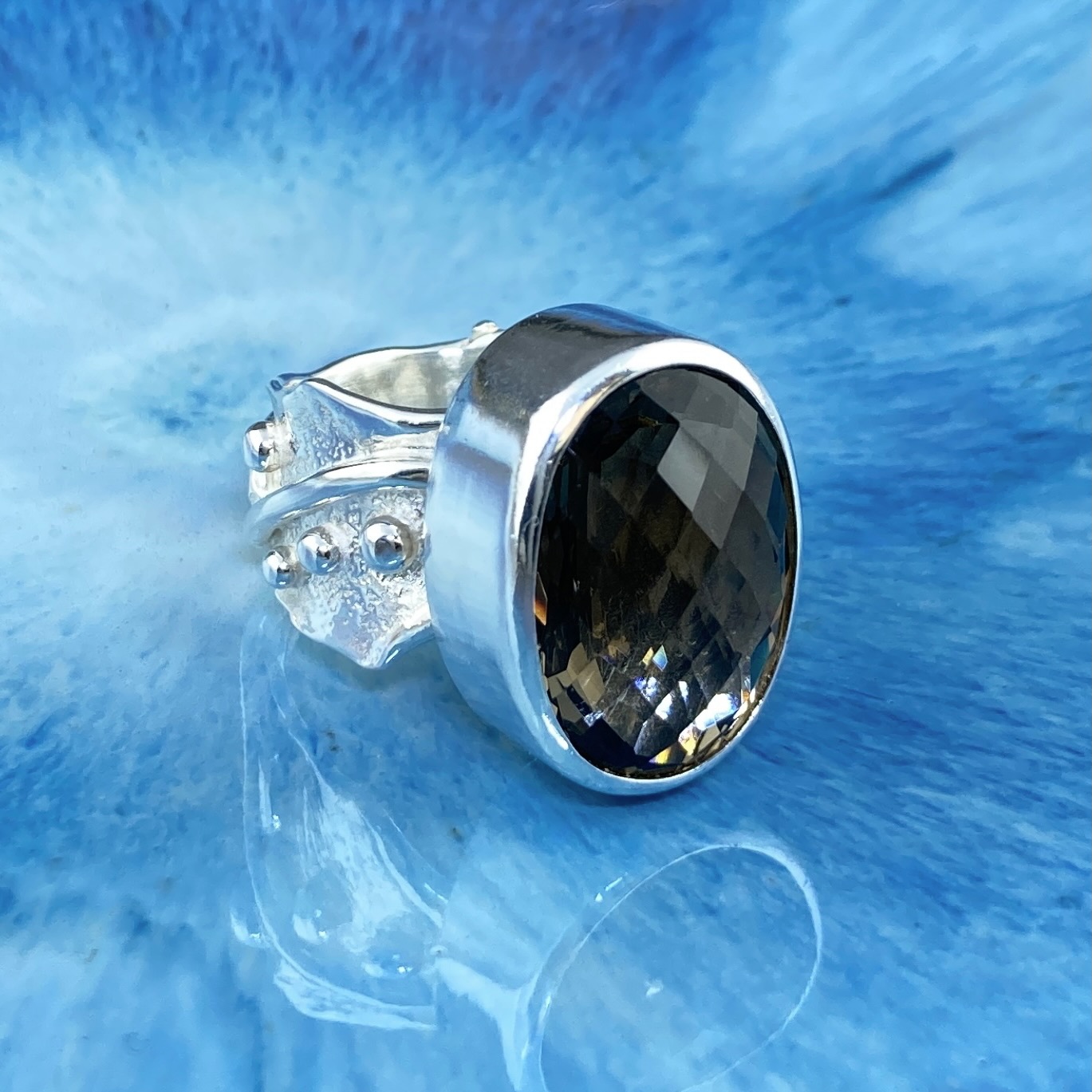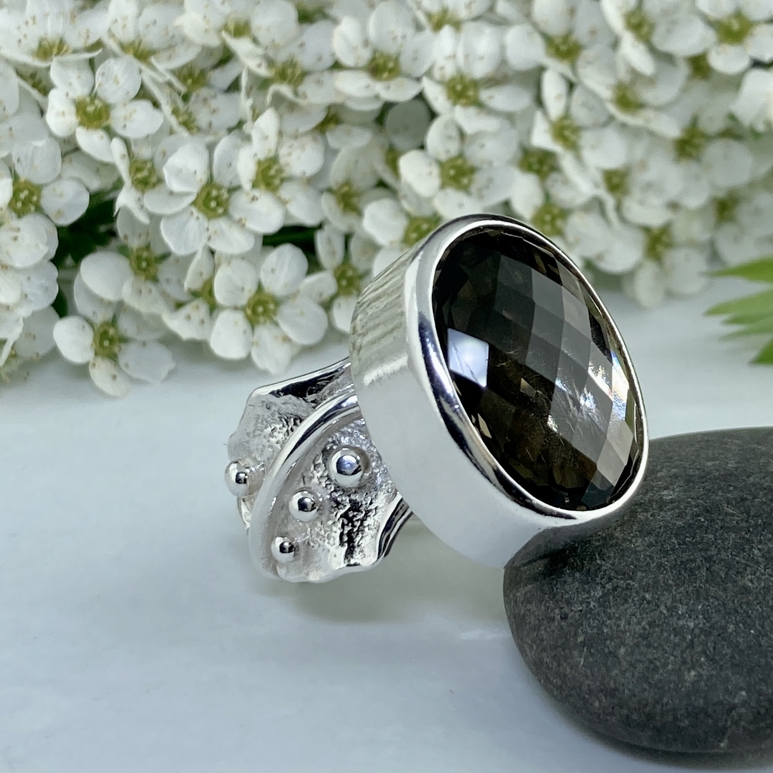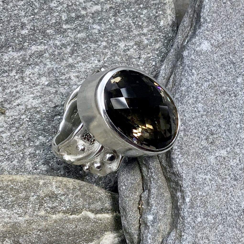 The Smoky Quartz Ring Size 6.5 Argentium Silver Waves reflects grounded elegance within a fluid, organic form. A 13-carat oval Smoky Quartz — natural and checkerboard-cut — rests in a flowing band that mirrors the movement of water and light.