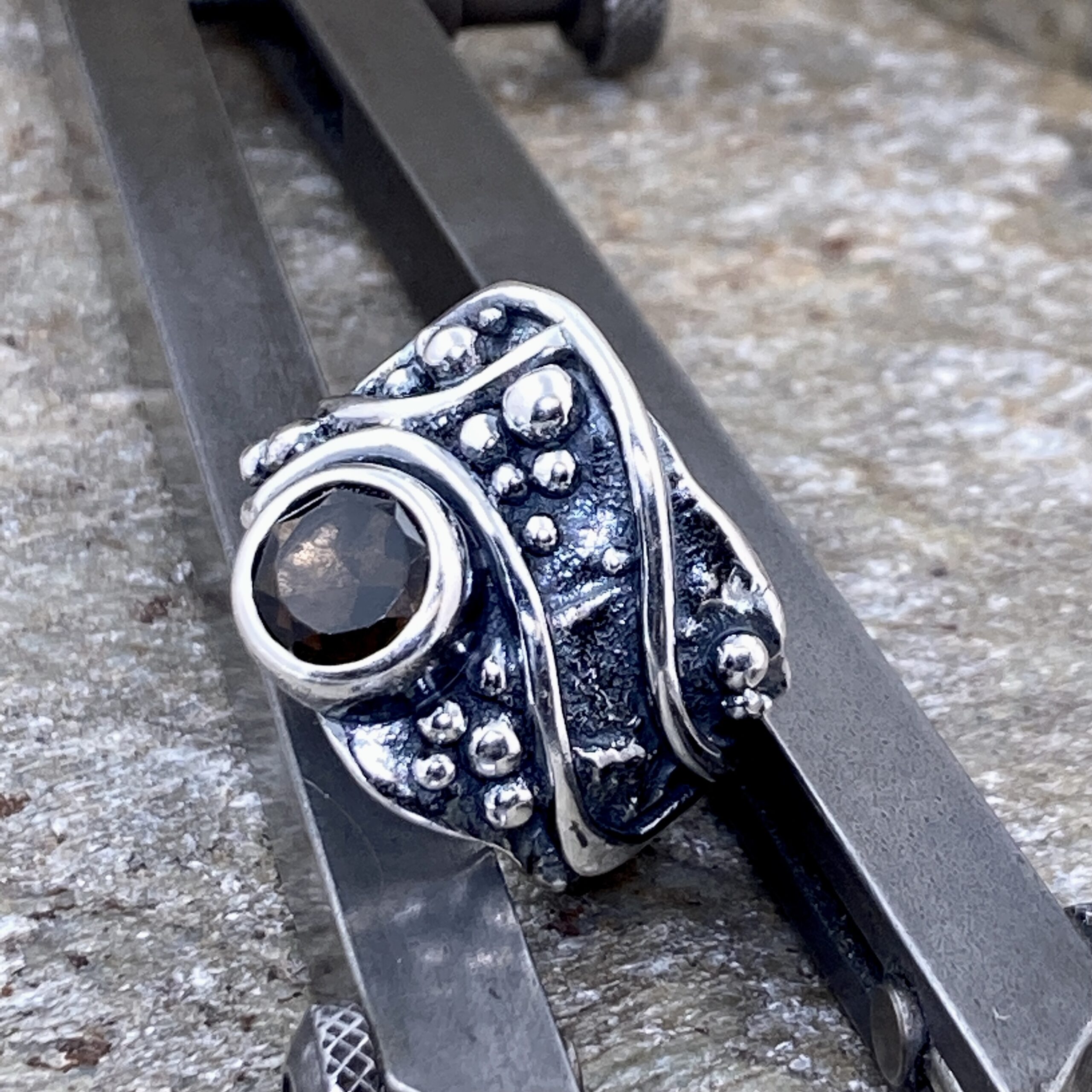 Handmade Smoky Quartz Waves design ring in Argentium silver. Antique finish with bezel-set gemstone and smooth, balanced fit.