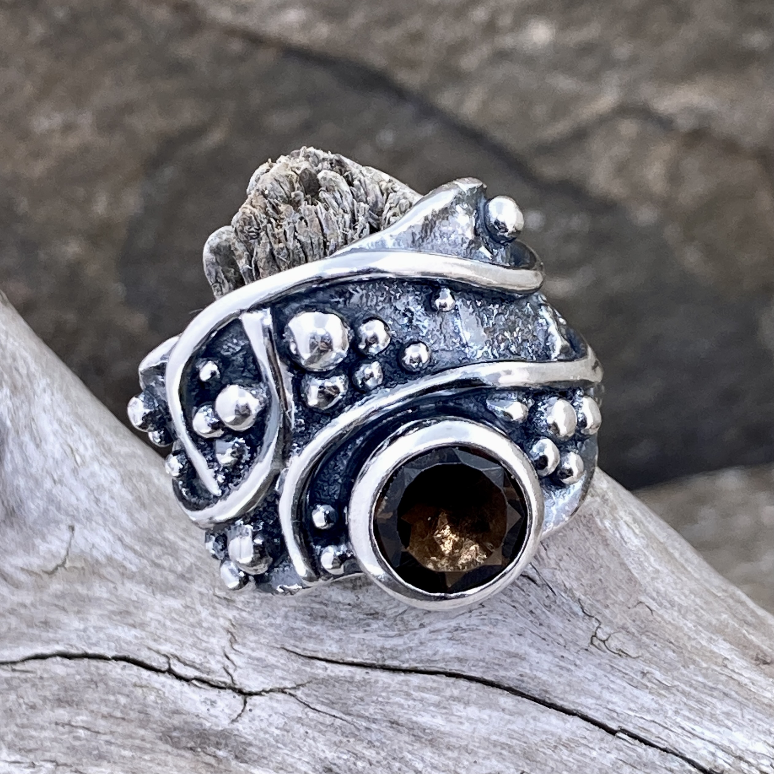 Each Waves ring begins as a band of Argentium silver that I fuse, shape, and texture by hand. After heat-treating the metal to activate its germanium layer for brightness and tarnish resistance, I bezel-set the Smoky Quartz and polish the surface to reveal the movement of the Waves design.