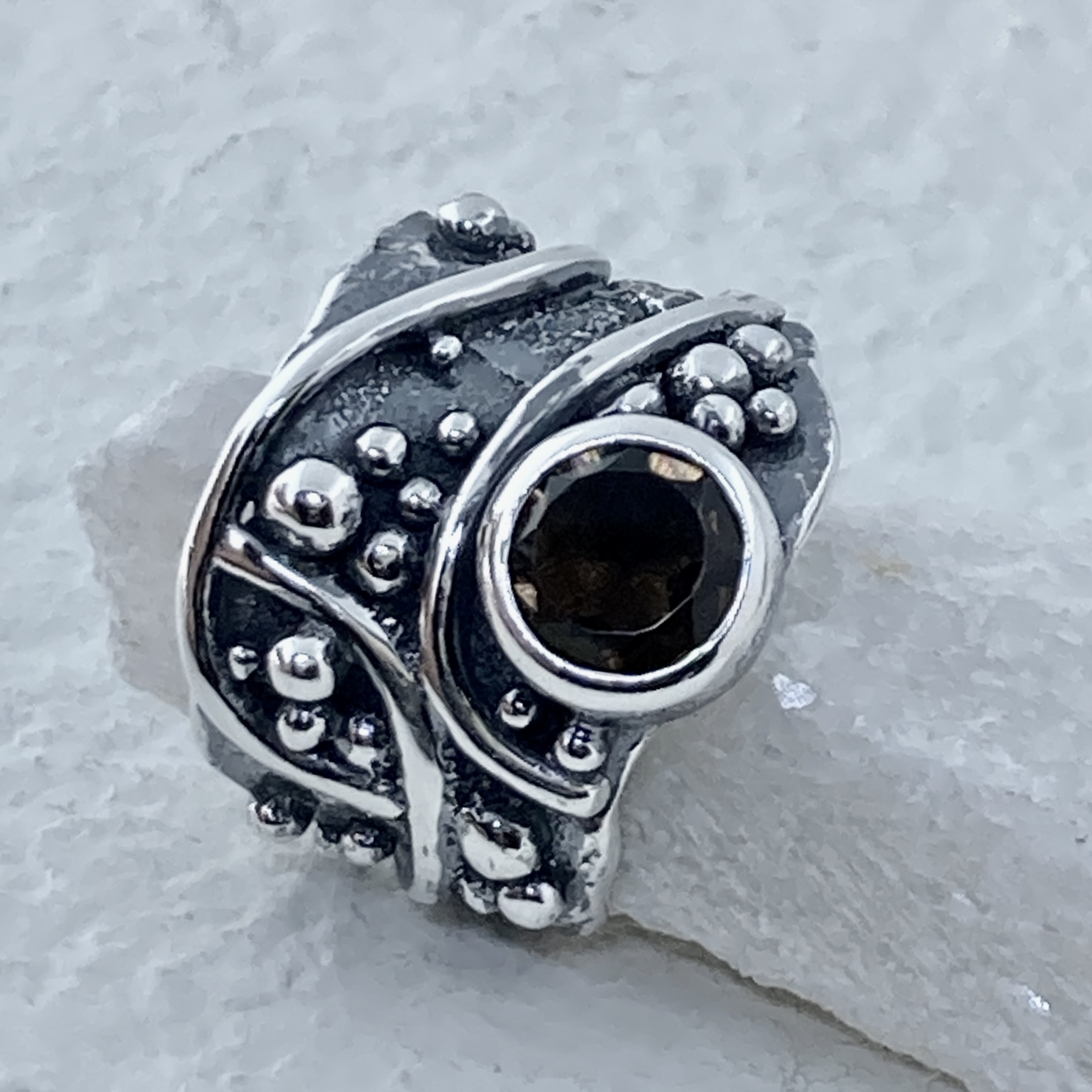 The Smoky Quartz Ring Size 7.25 Argentium Silver Waves design captures calm motion and soft contrast. A 2 carat brilliant-cut Smoky Quartz rests in a smooth bezel, its warm tone reflecting against the cool antique silver. The combination of light and depth gives the piece a quiet, balanced strength.