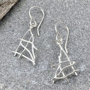 Smoky Quartz in a marquise cut – 23 carats – IF quality – mined in Africa.  I have laid out silver pieces and fused them together, to look like a little pile of twigs.  And then capped the matching pair of Smoky Quartz stones with them.
