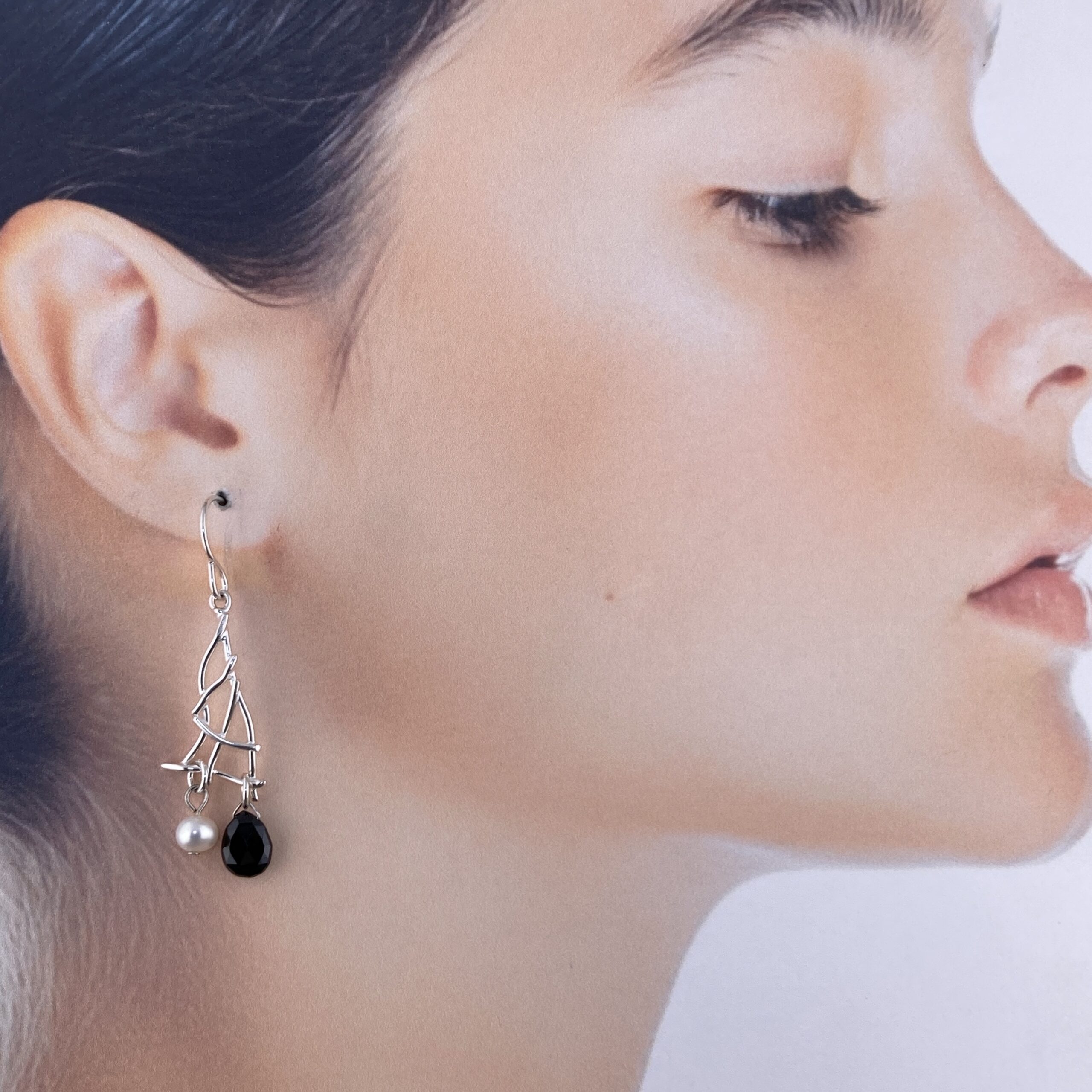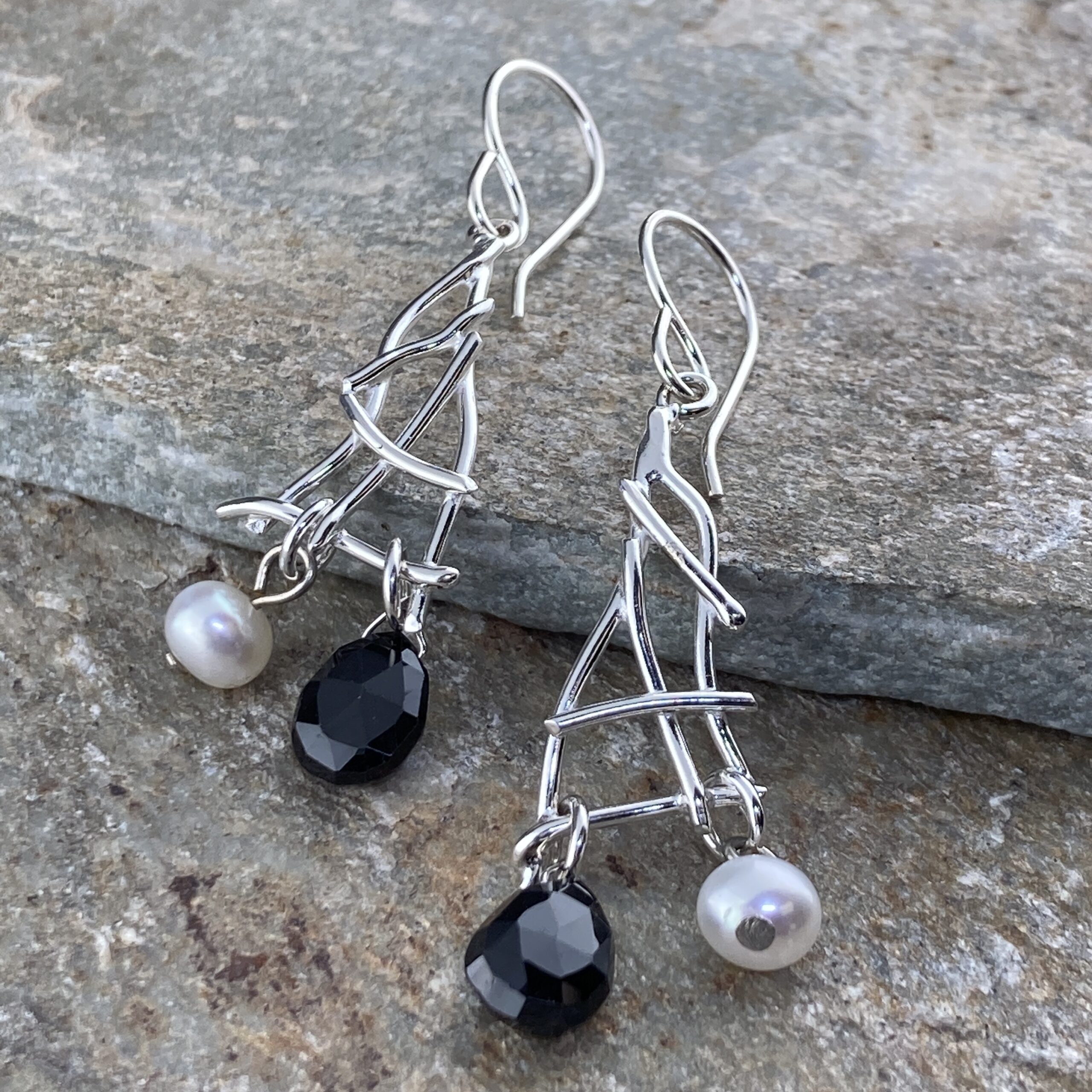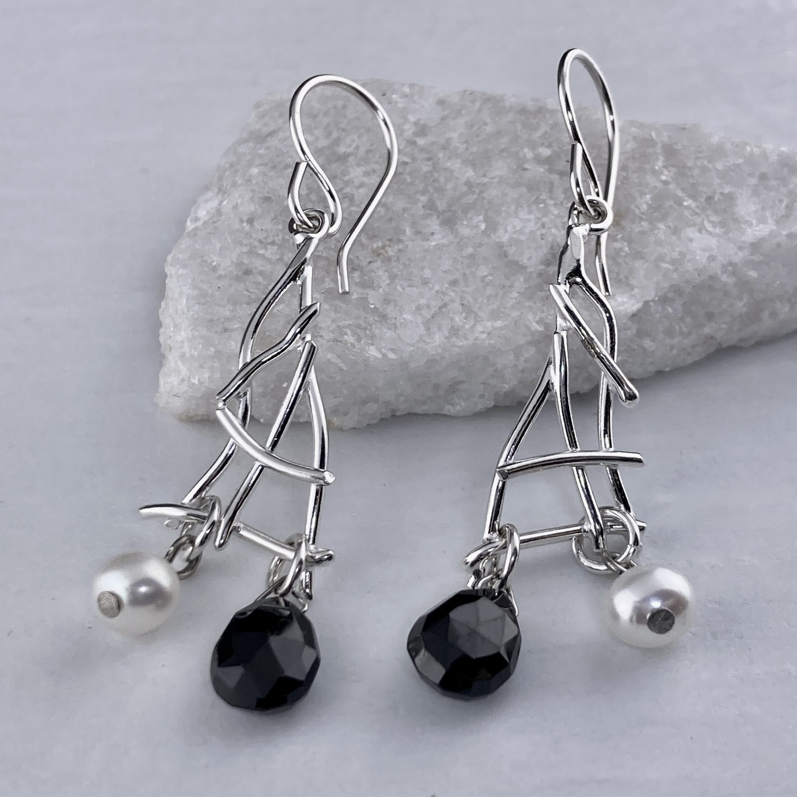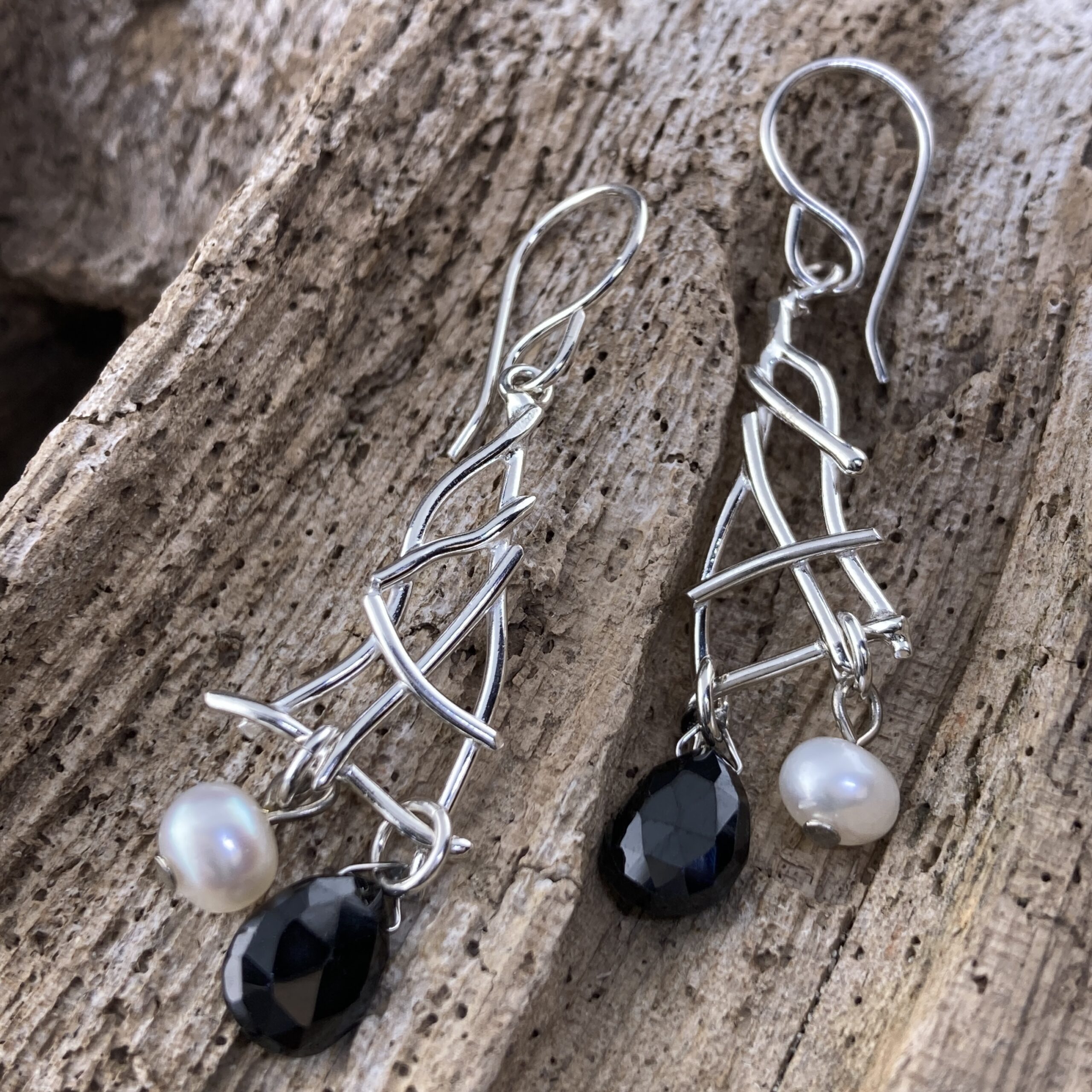 spinel and pearl – twigs in a sail shape.  Argentium silver twigs placed in a sail shape and fused.  With  Spinel and Pearl accents.