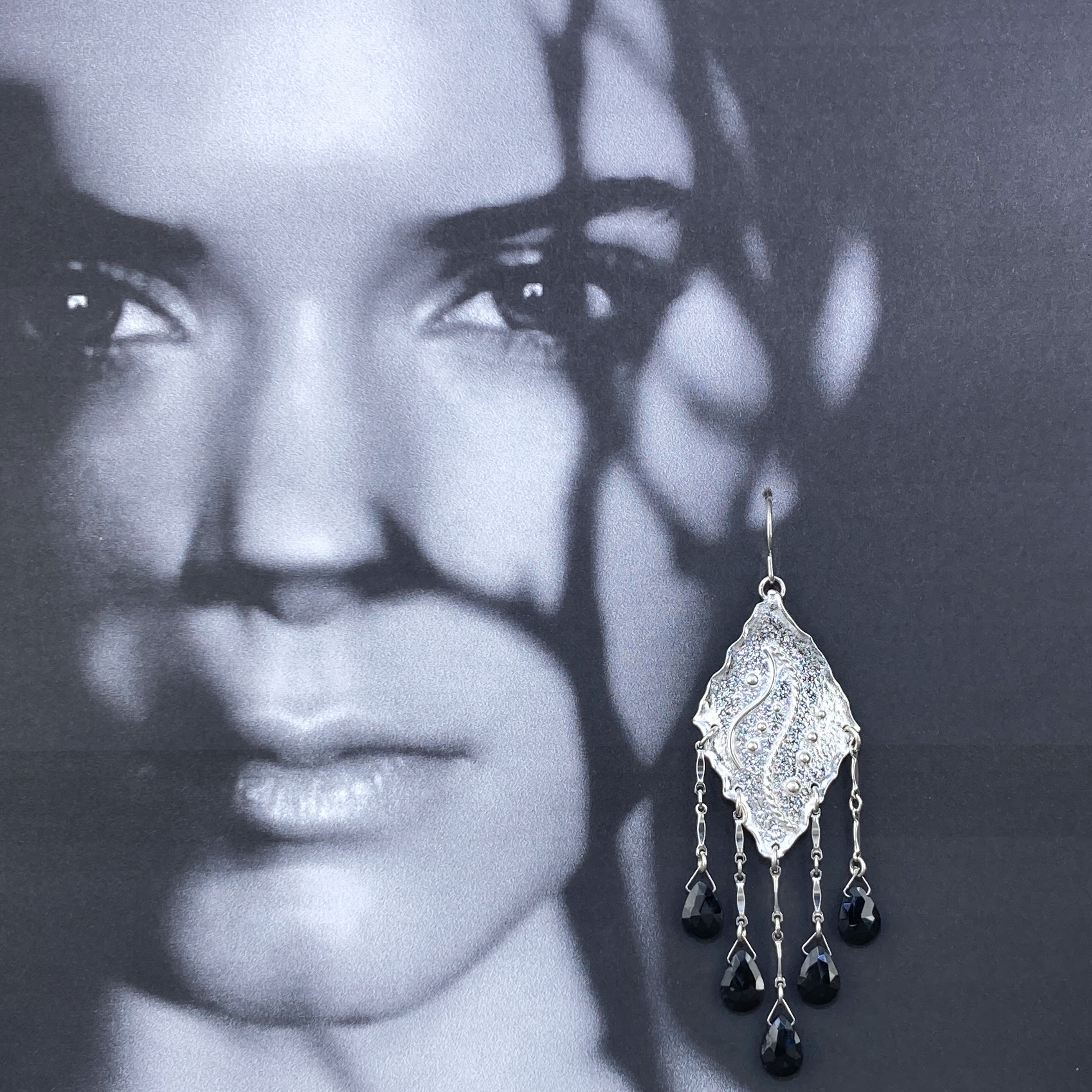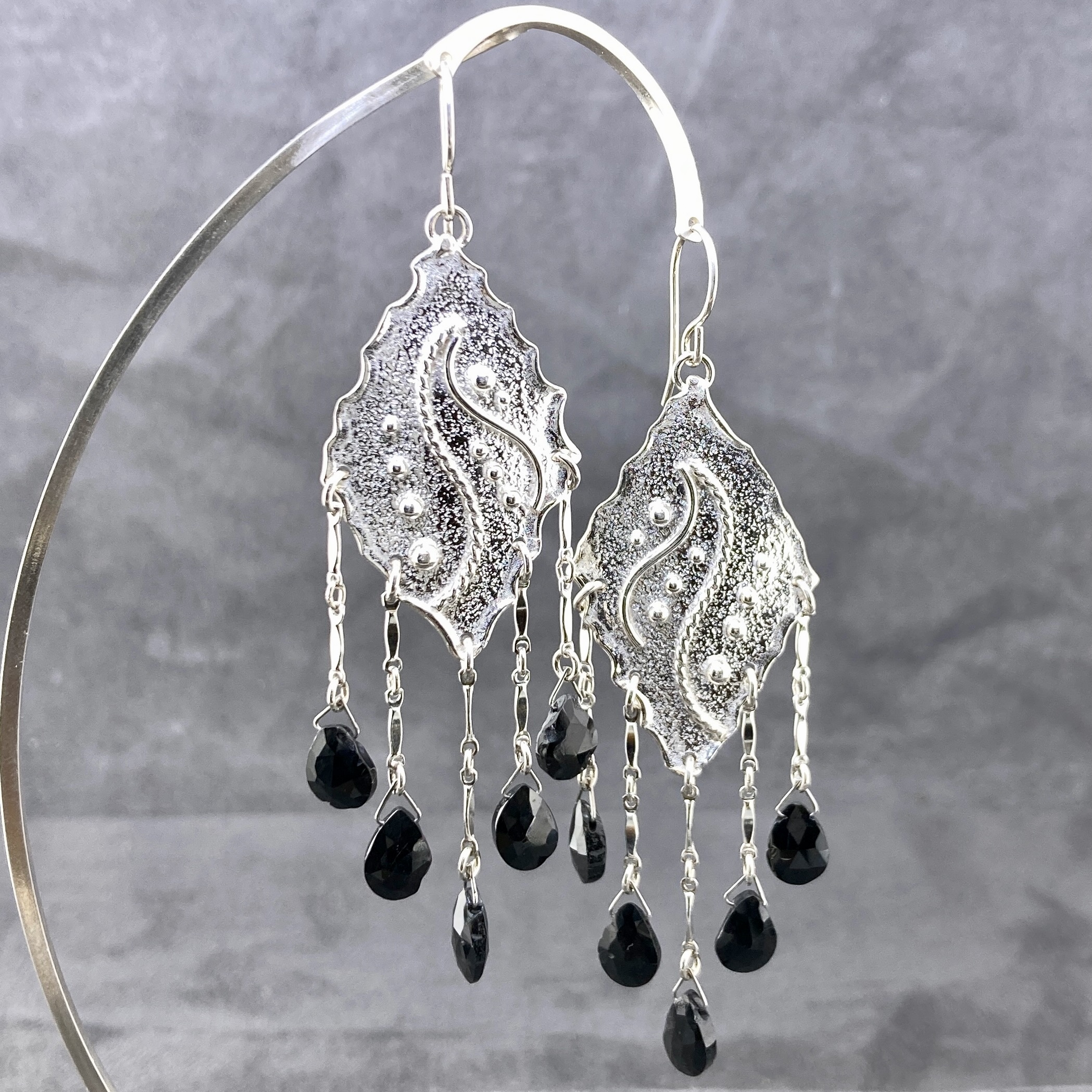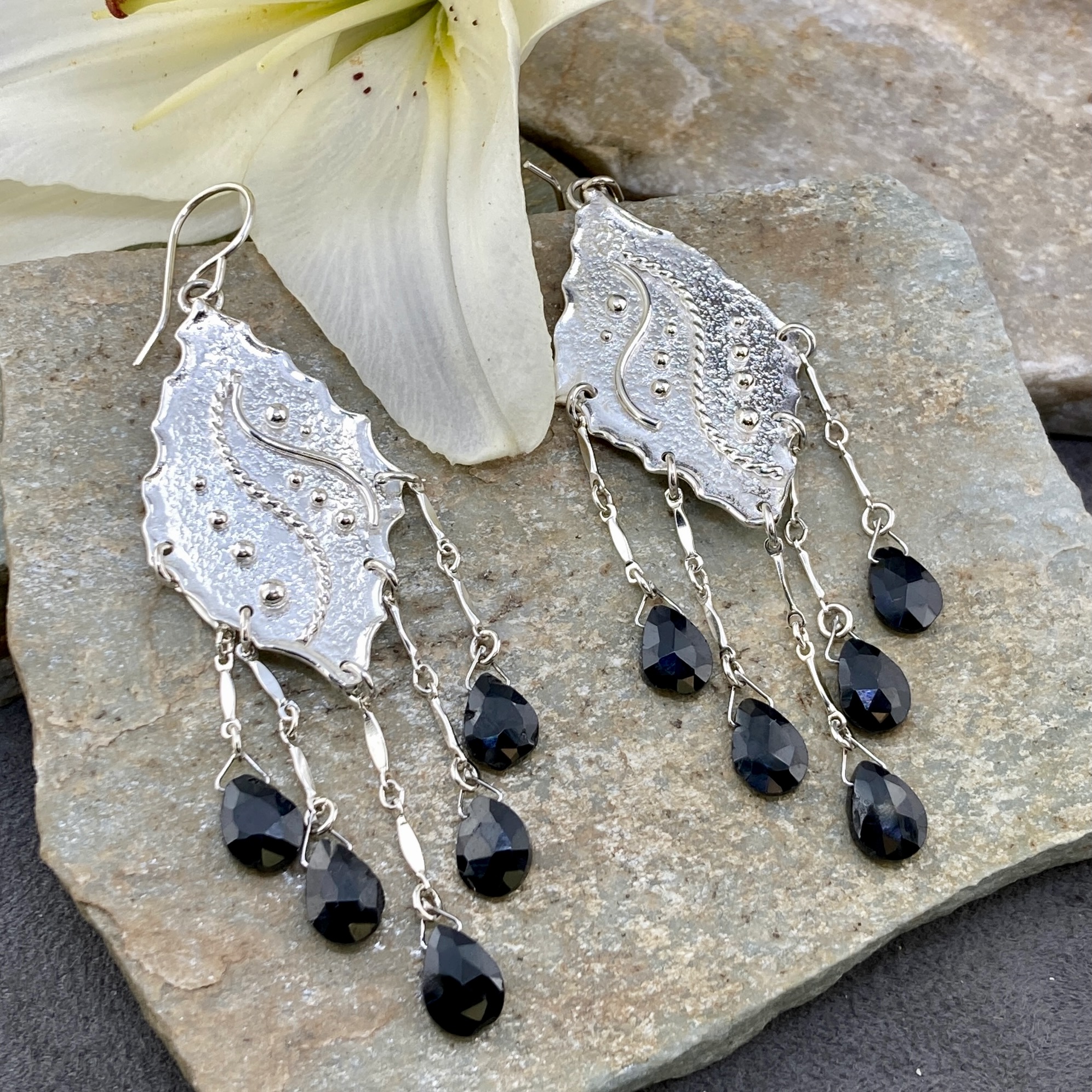 Earrings are 8.3 cm long by 2.5 cm wide.
