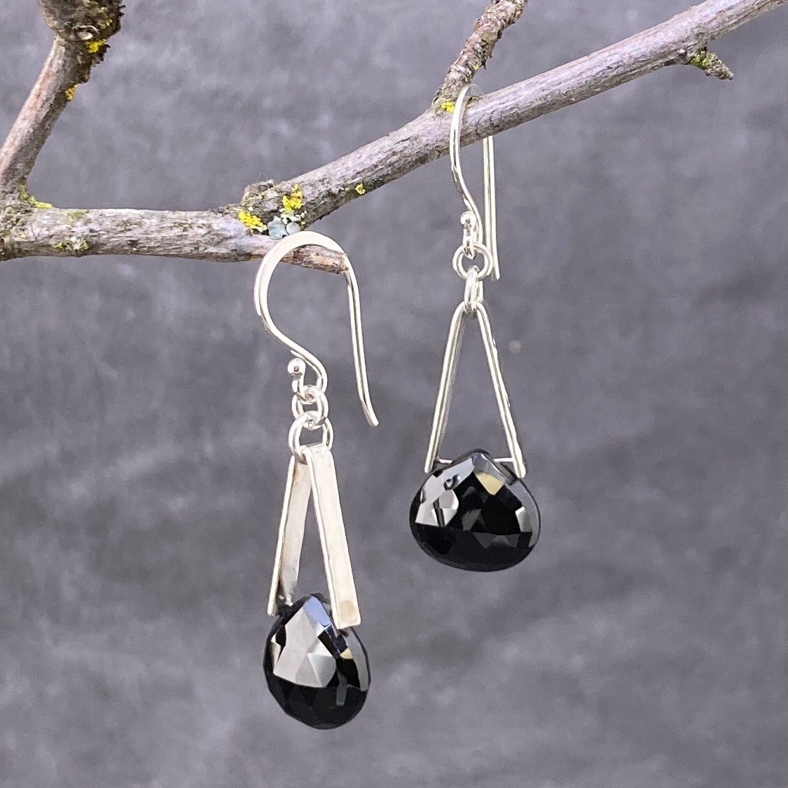 Hand hammered Argentium silver in a V bail design. Holding natural, facetted Spinel in a teardrop shape. The shorter version of my hand made Argentium silver earwires suspends these beauties.