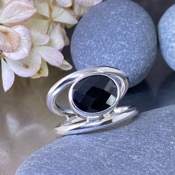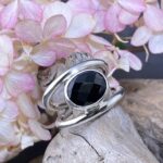 This natural Spinel is an oval, checkerboard-cut gemstone weighing about 5.5 carats. It shows a rich, dark tone with flashes of light across its faceted surface. The gem sits low between the silver bands, catching subtle reflections while staying well-protected in its bezel.