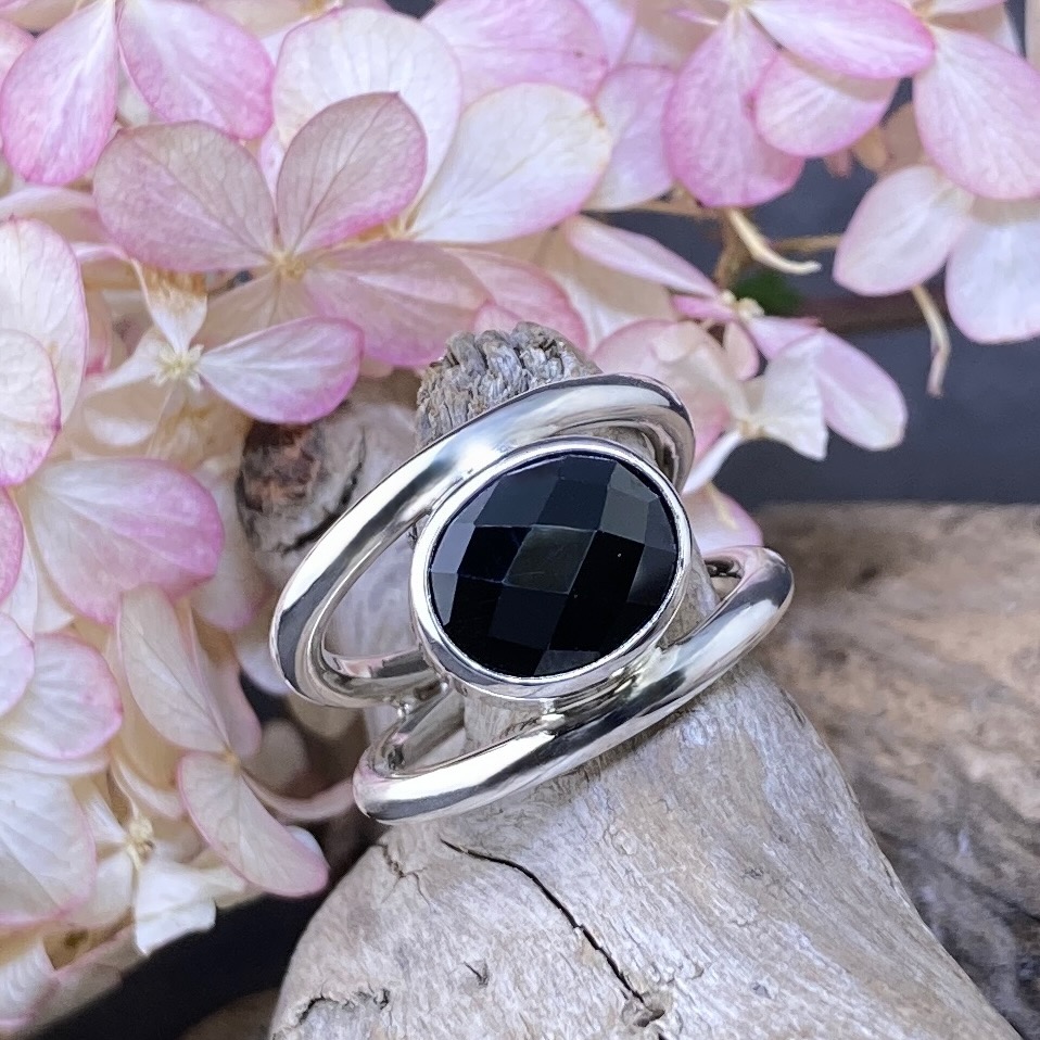 Each ring begins with two rounded strips of Argentium 940 silver. I shape and fuse them together to create a double-band form that curves naturally around the finger. The wide front supports the stone, while the taper at the back prevents spin and adds comfort. The smooth surface and even weight make this one of the most comfortable styles to wear.