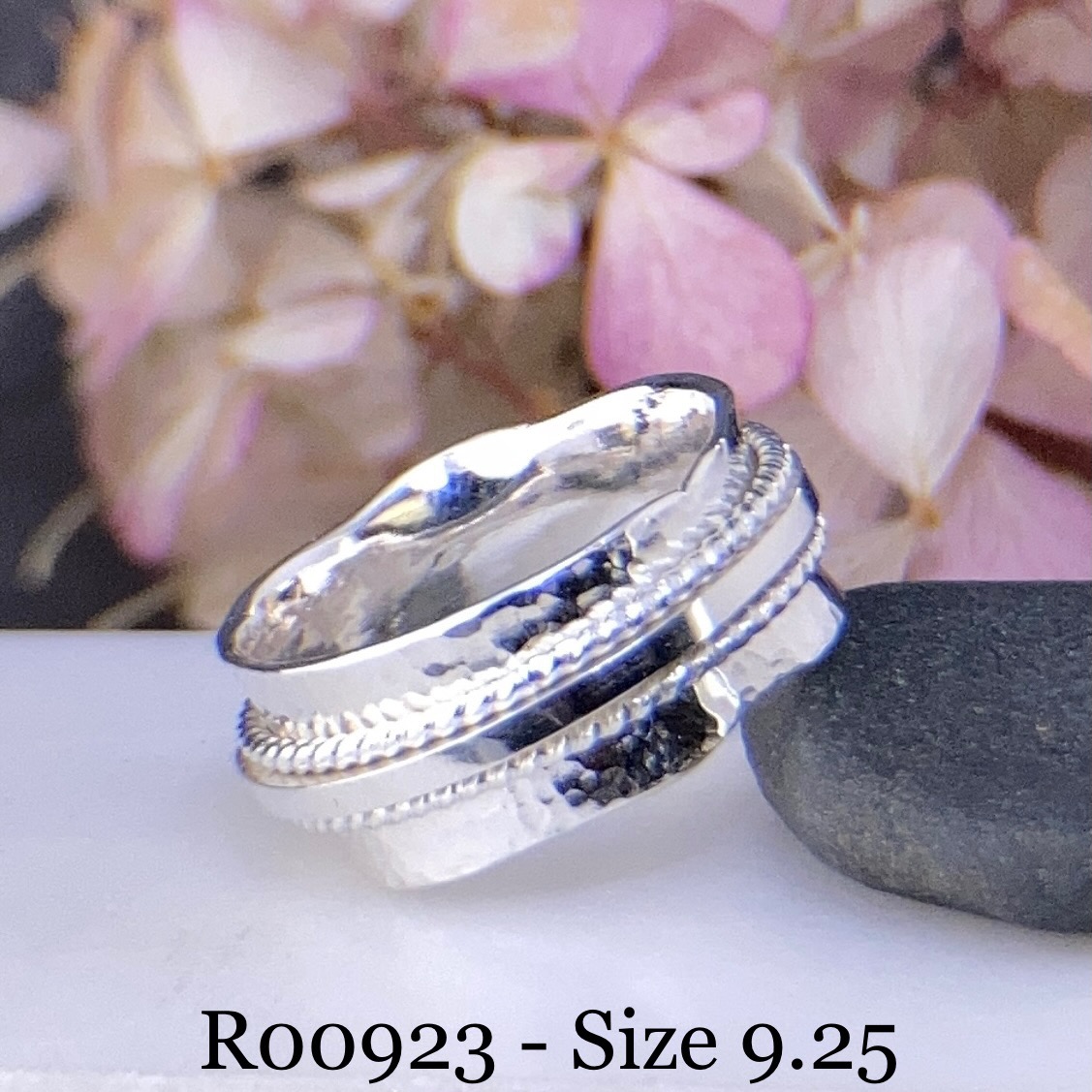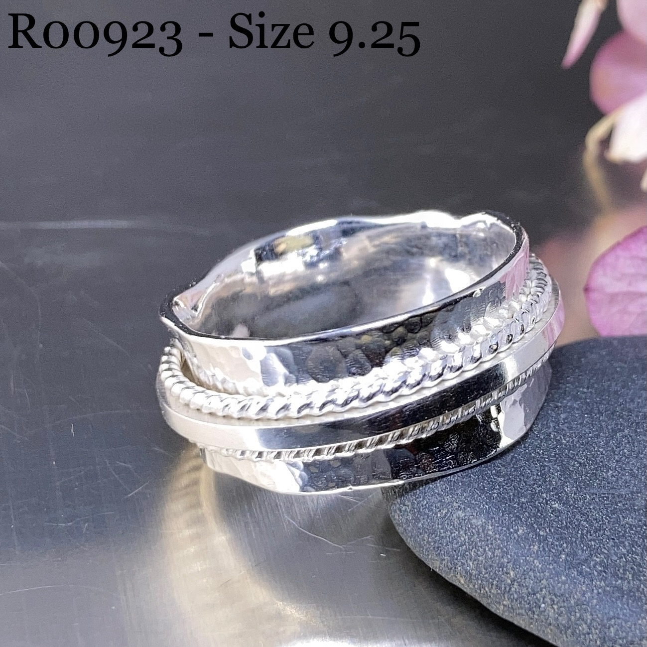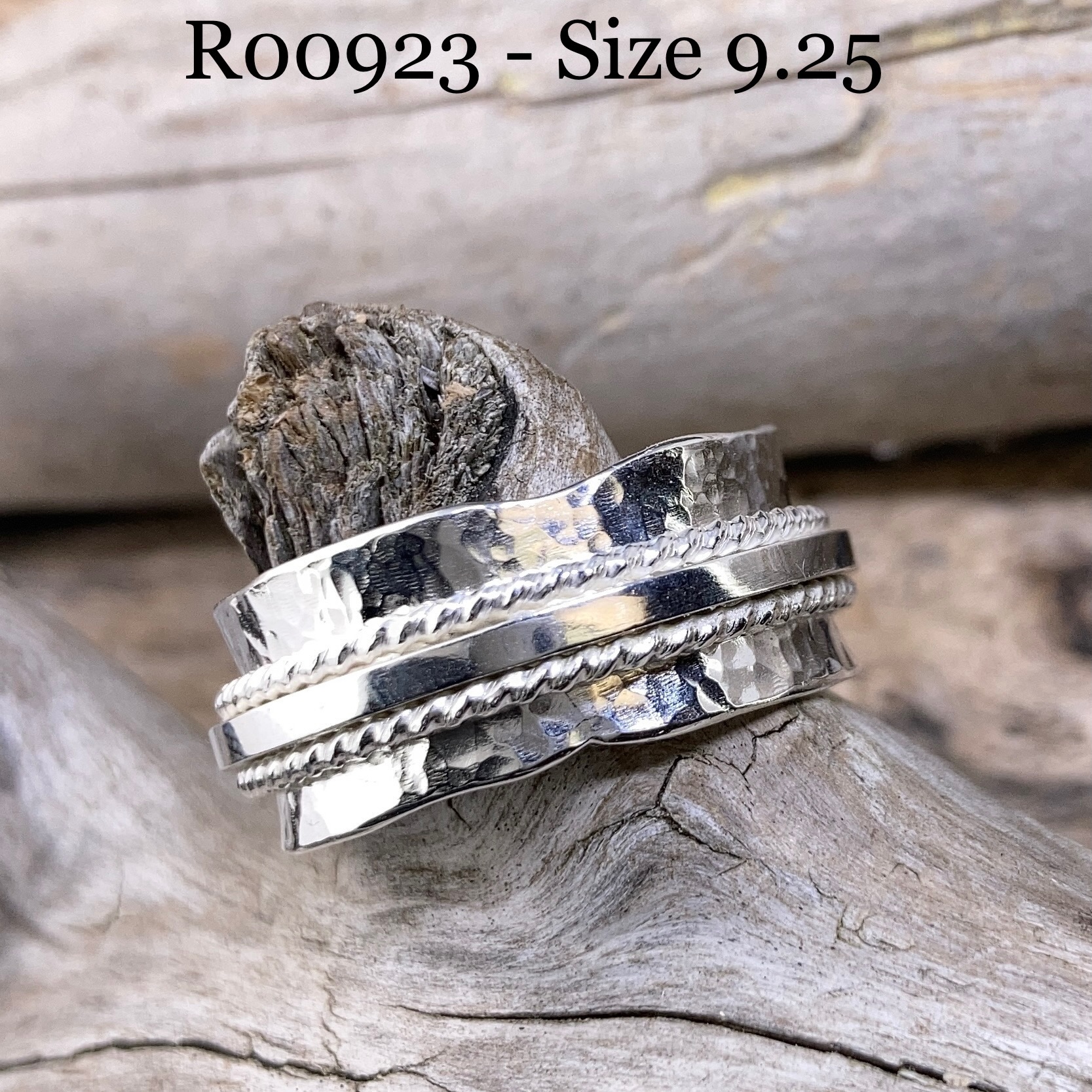 A handmade spinner ring, with three spinner bands.  Heavy weight Argentium silver with a hand-hammered texture.  I have left this edge irregular for an organic look.