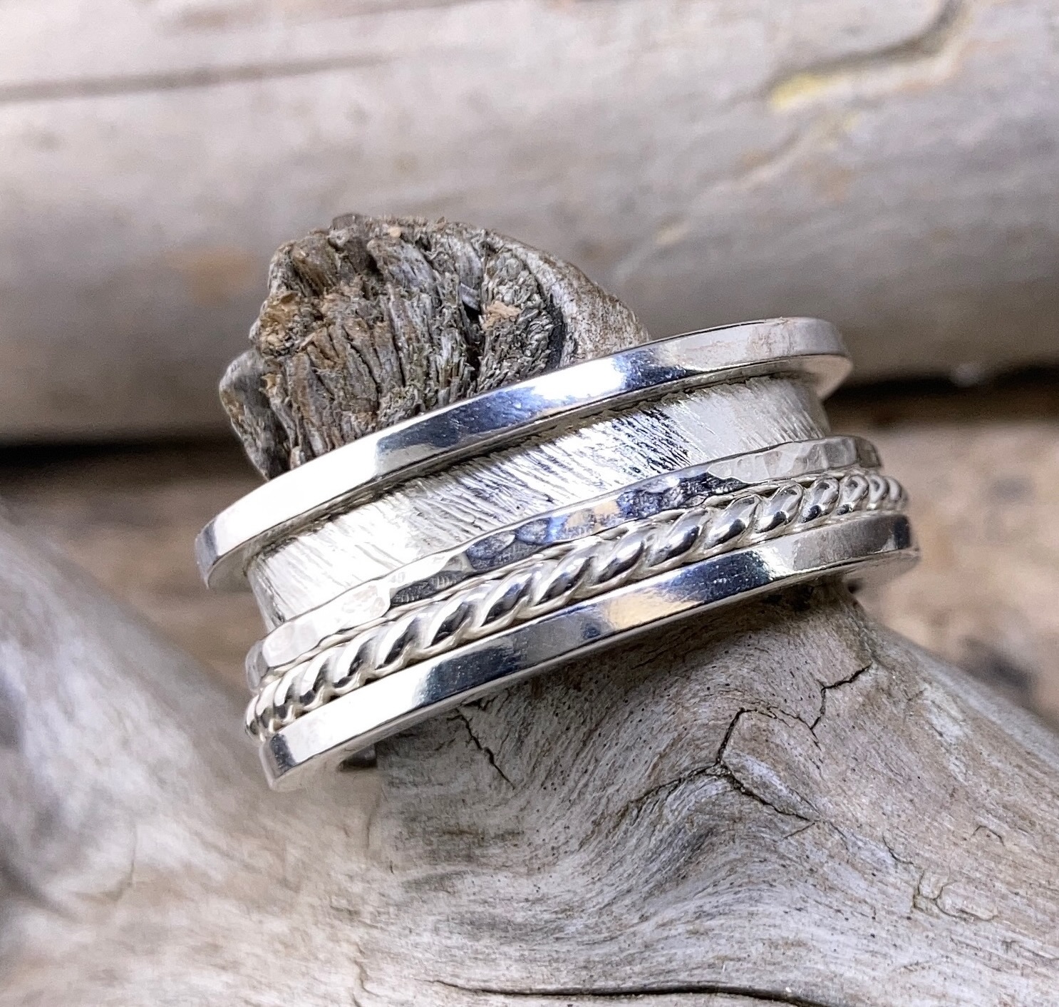 The contrast defines this ring. The linear texture on the main band stays crisp and architectural. Meanwhile, the two spinner bands add motion and interest. One spinner uses a square hammered texture. The other uses twisted wire. Together, they balance structure with detail. The ring feels solid, controlled, and purposeful, yet the movement keeps it engaging.