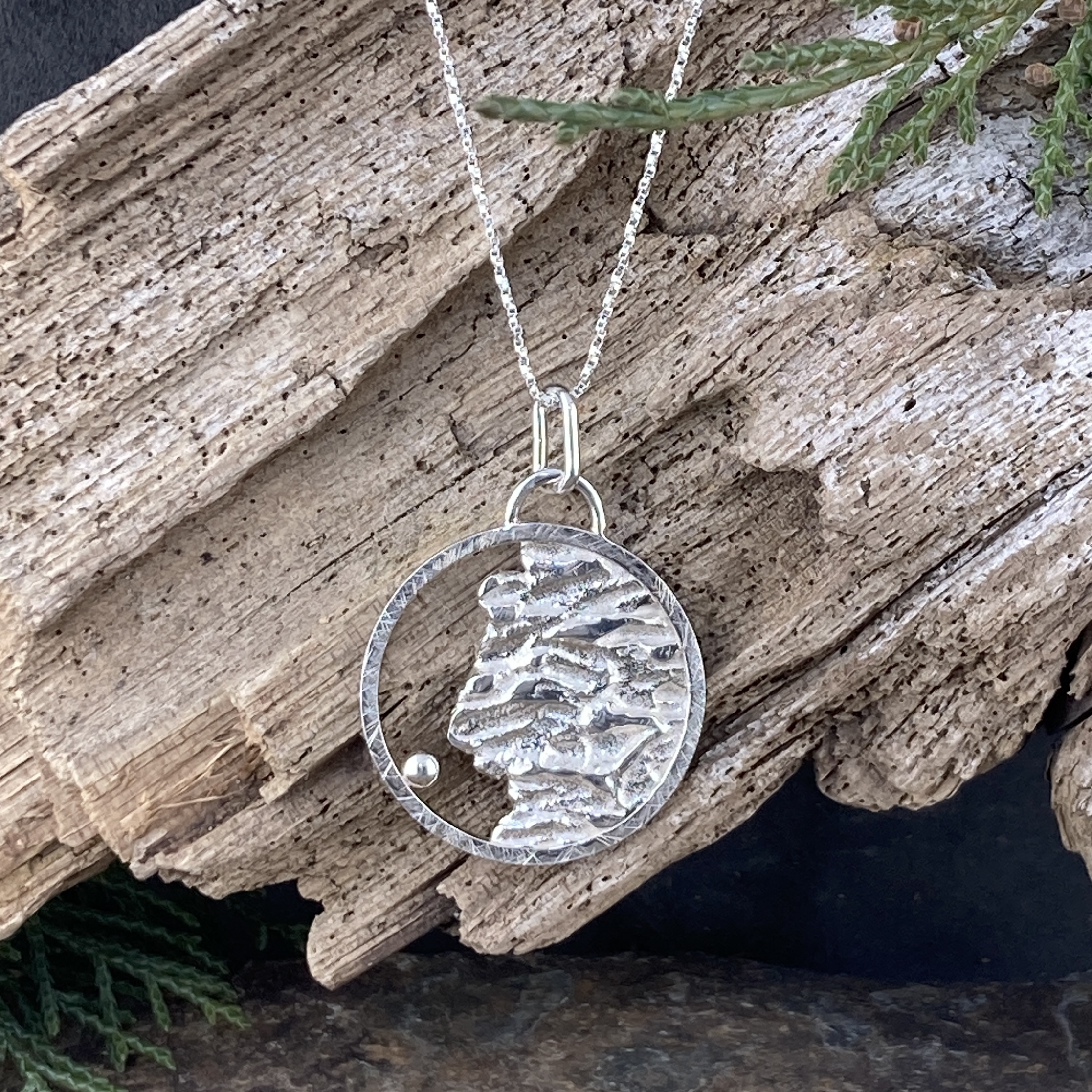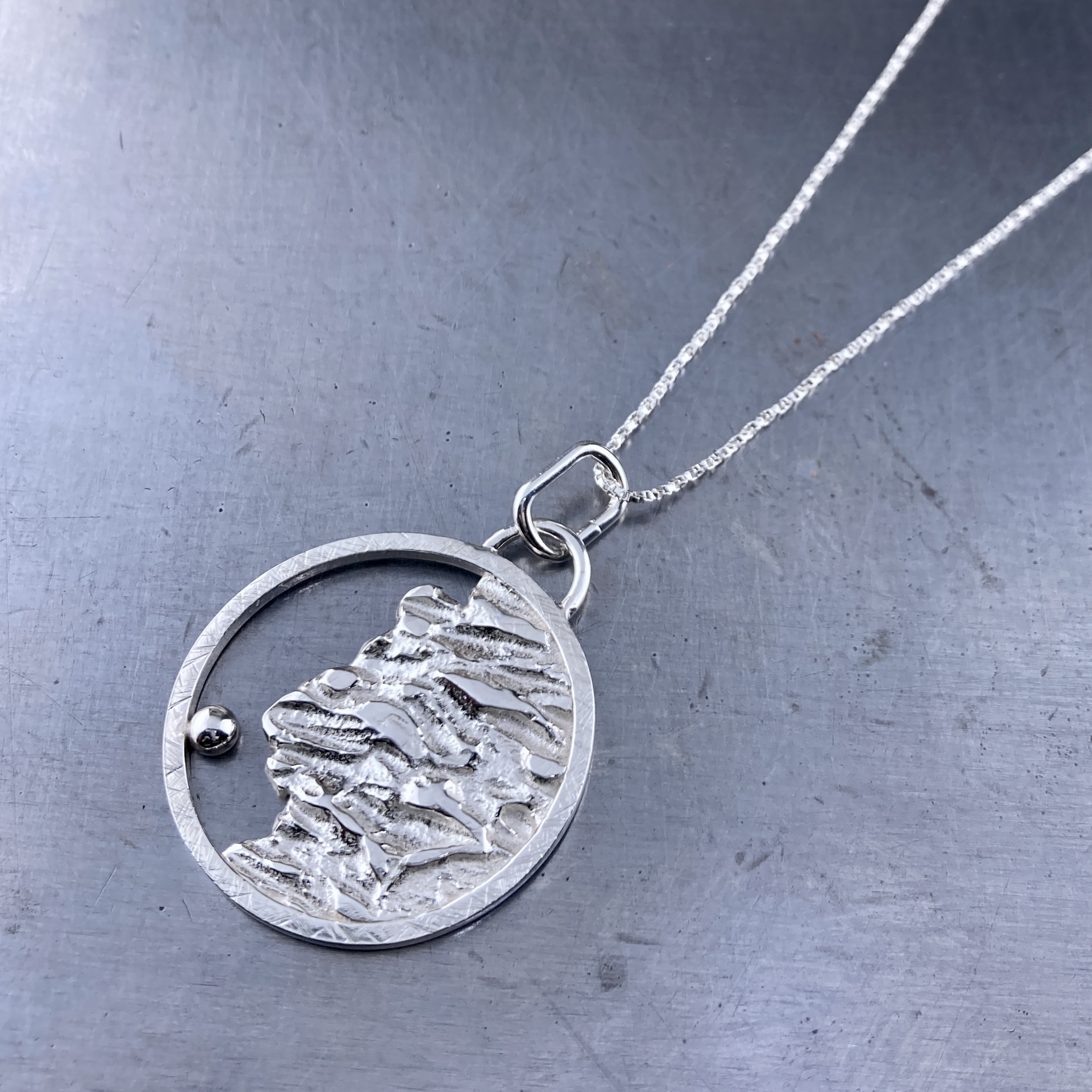 Sun and moon – lunar pendant. Handmade with Argentium silver. I create the Lunar moon by melting and then manipulating the liquid silver until it looks like the surface of the moon. And then I make a textured sun to circle the moon.