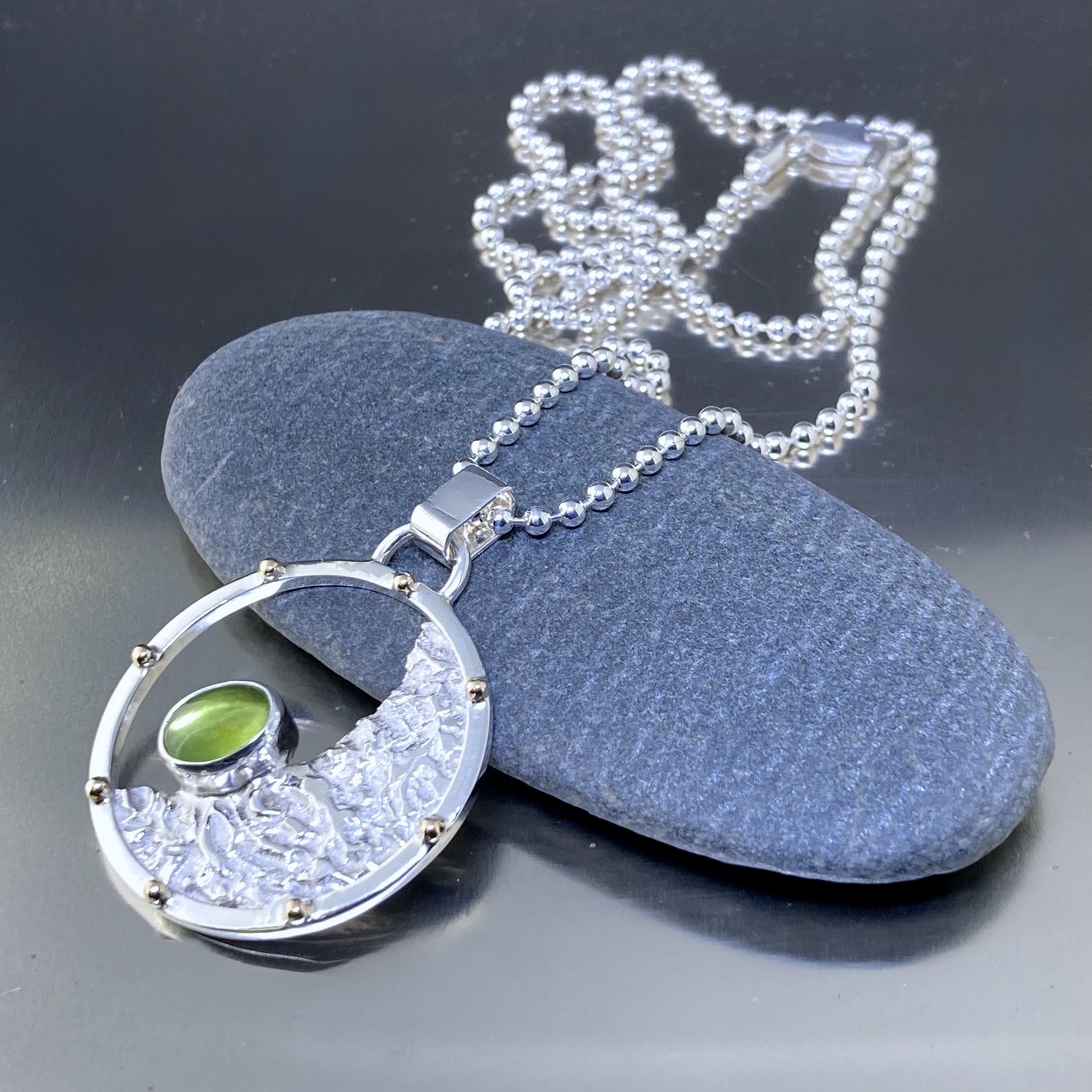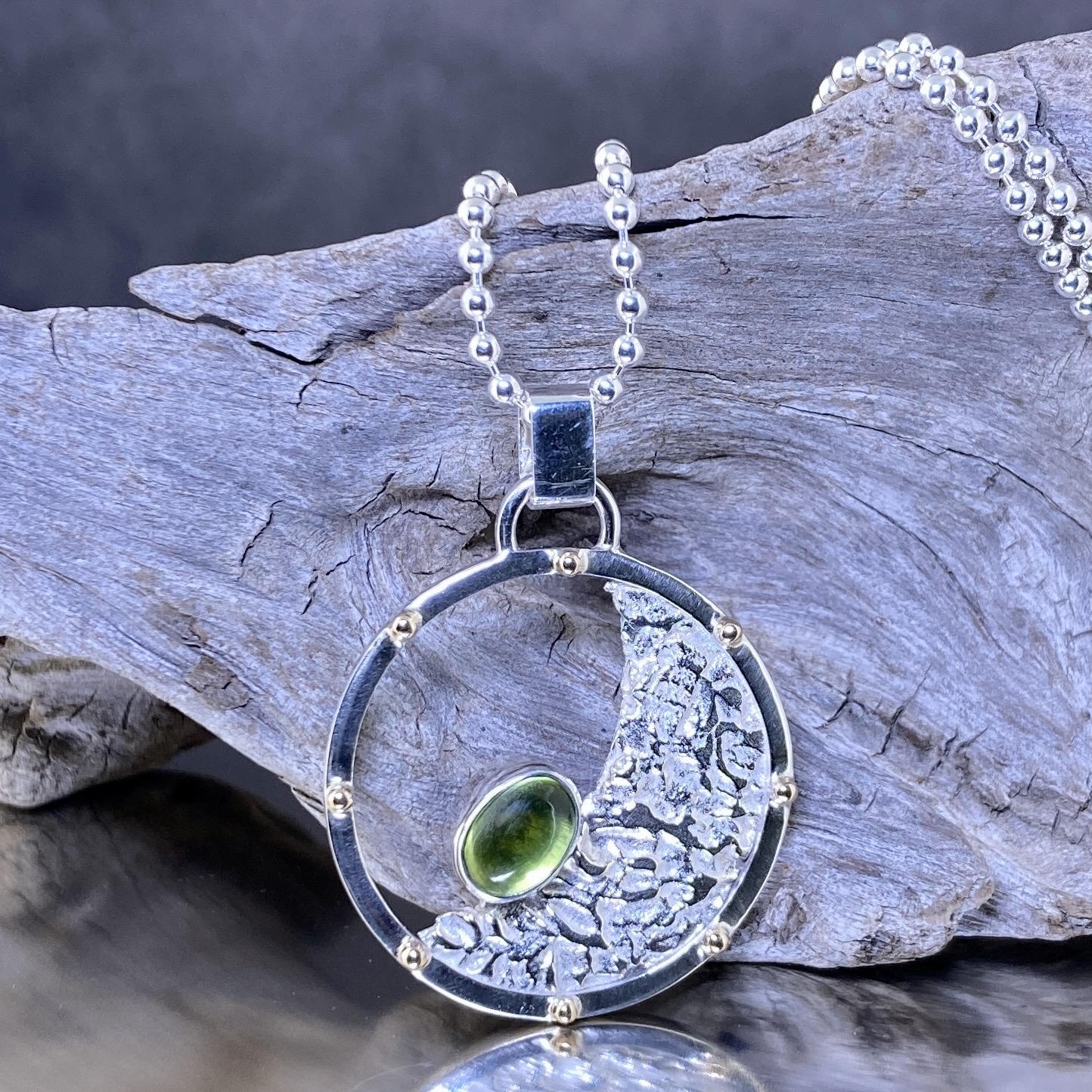 This Sun and Moon pendant is handmade in solid Argentium Silver 940. First, I texture the lunar surface to create depth and dimension. Then I set a flawless 2 carat oval cabochon Peridot at the centre. Around the sun ring, I add solid 10K gold accent granules for warmth and contrast. Finally, I refine and polish the surface to a clean, bright finish.