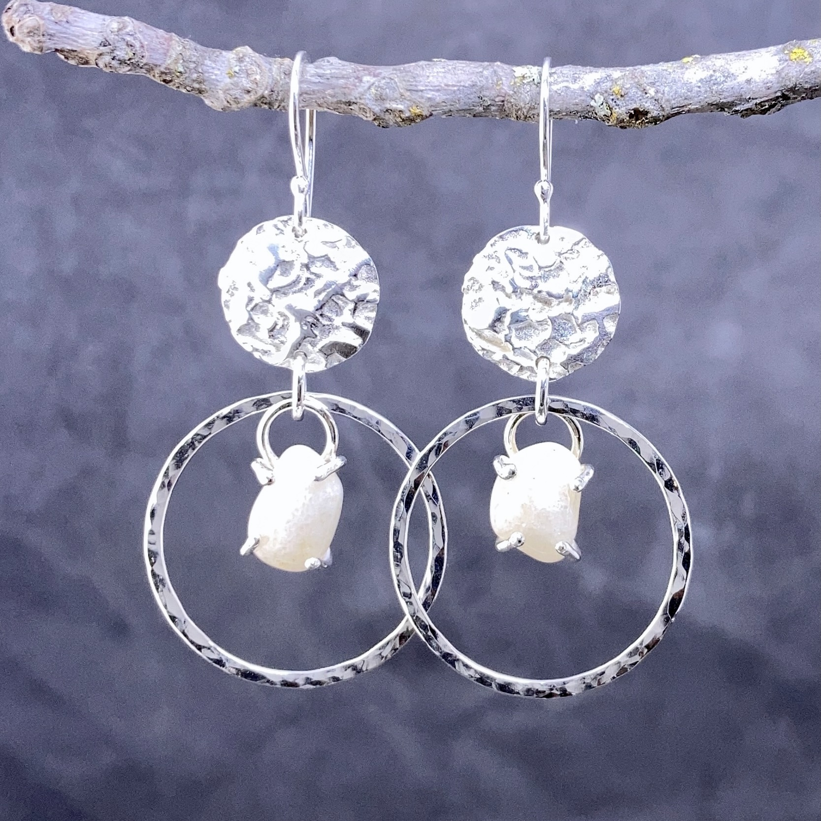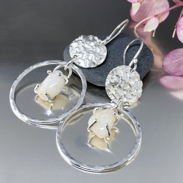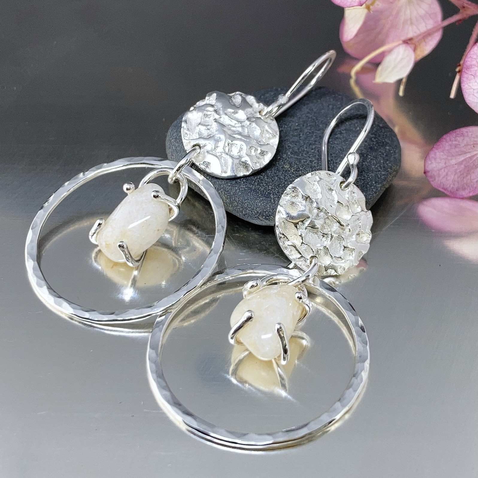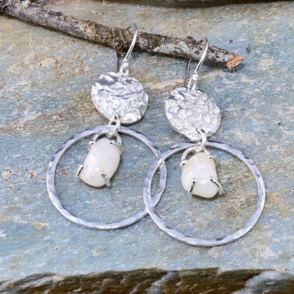 An Argentium silver Sun circling a raw Quartz gemstone. The quartz is suspended in a casual prong setting. And over the Sun and Quartz is a Lunar full Moon.