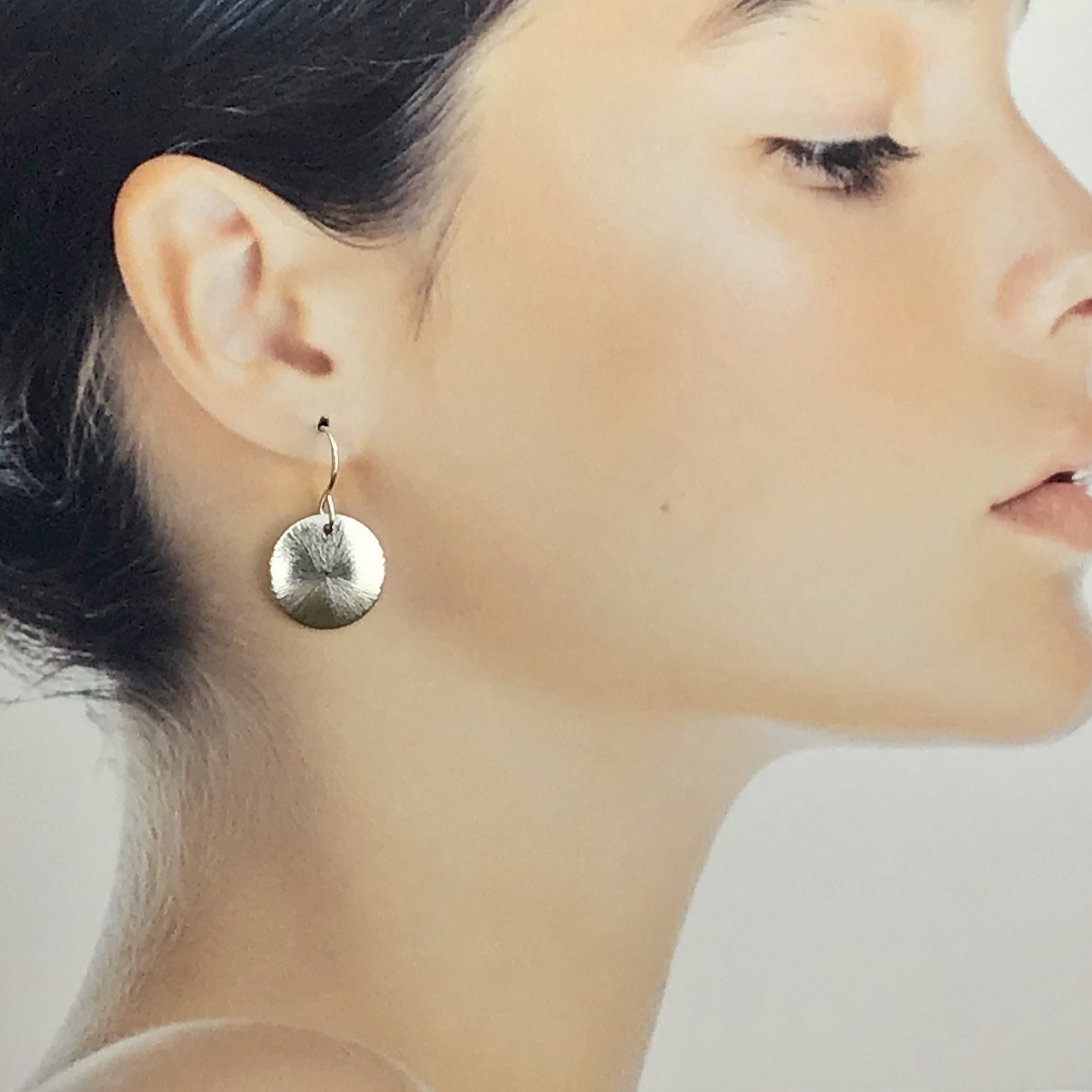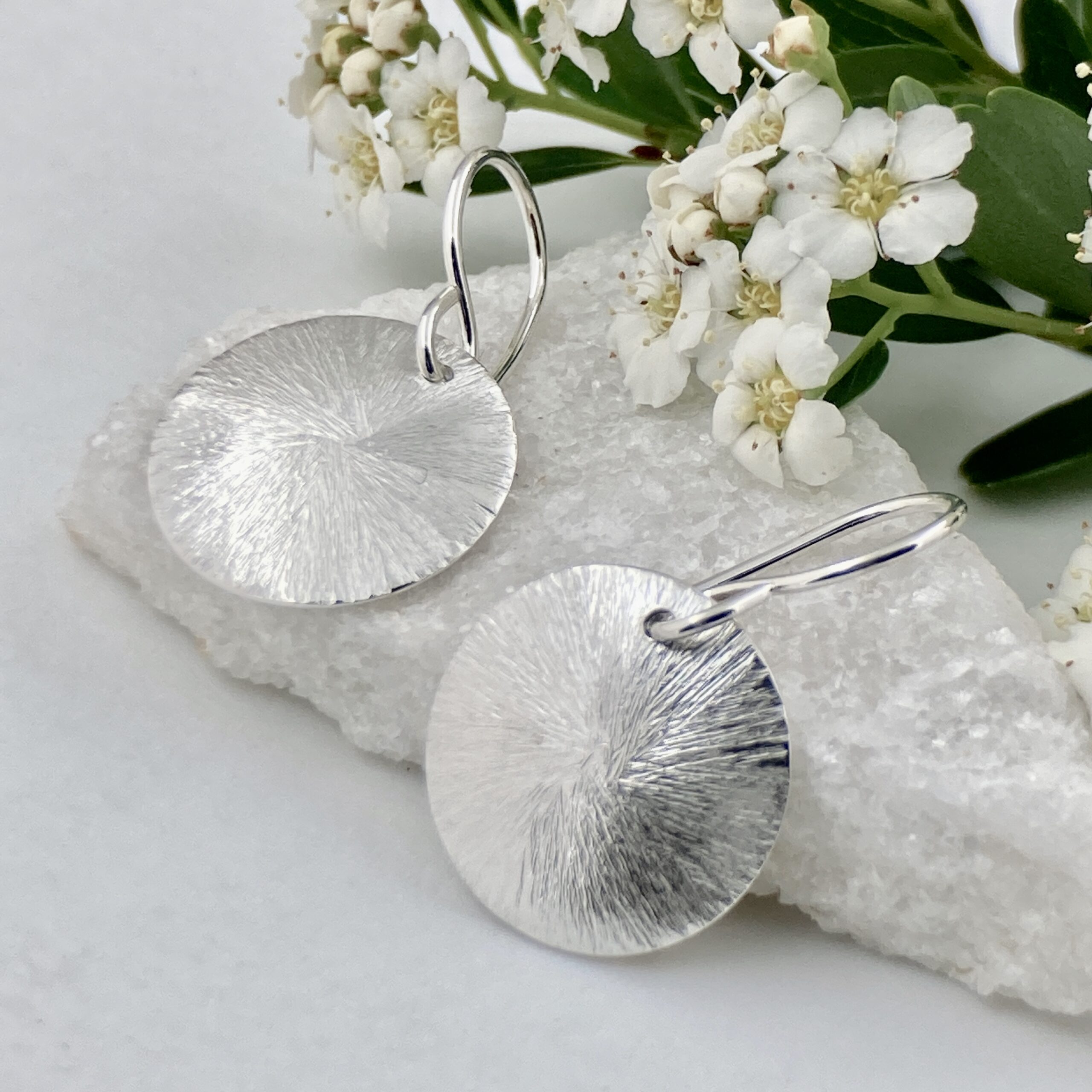 Argentium silver domes – suns with hand-etched rays, in a drop earring style.