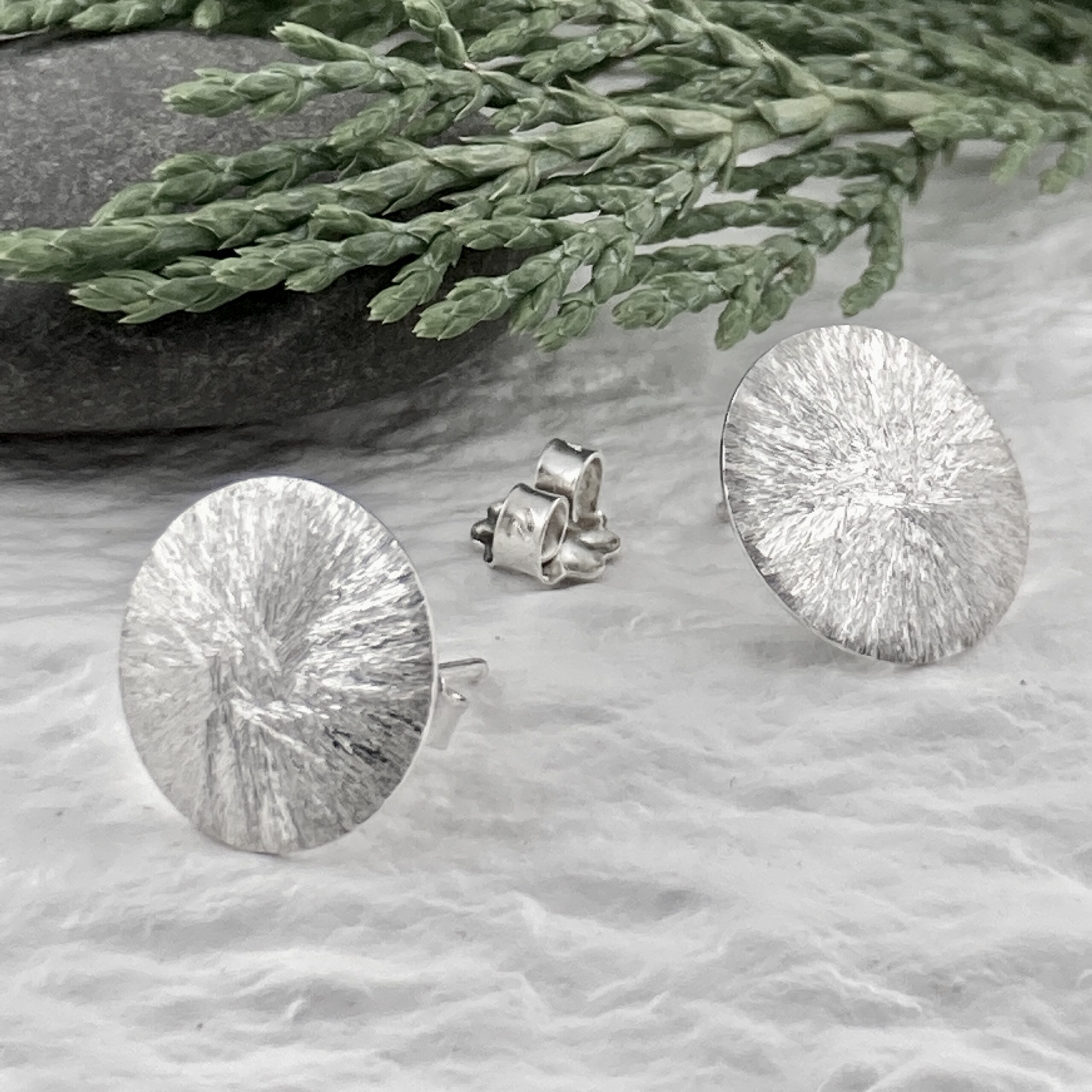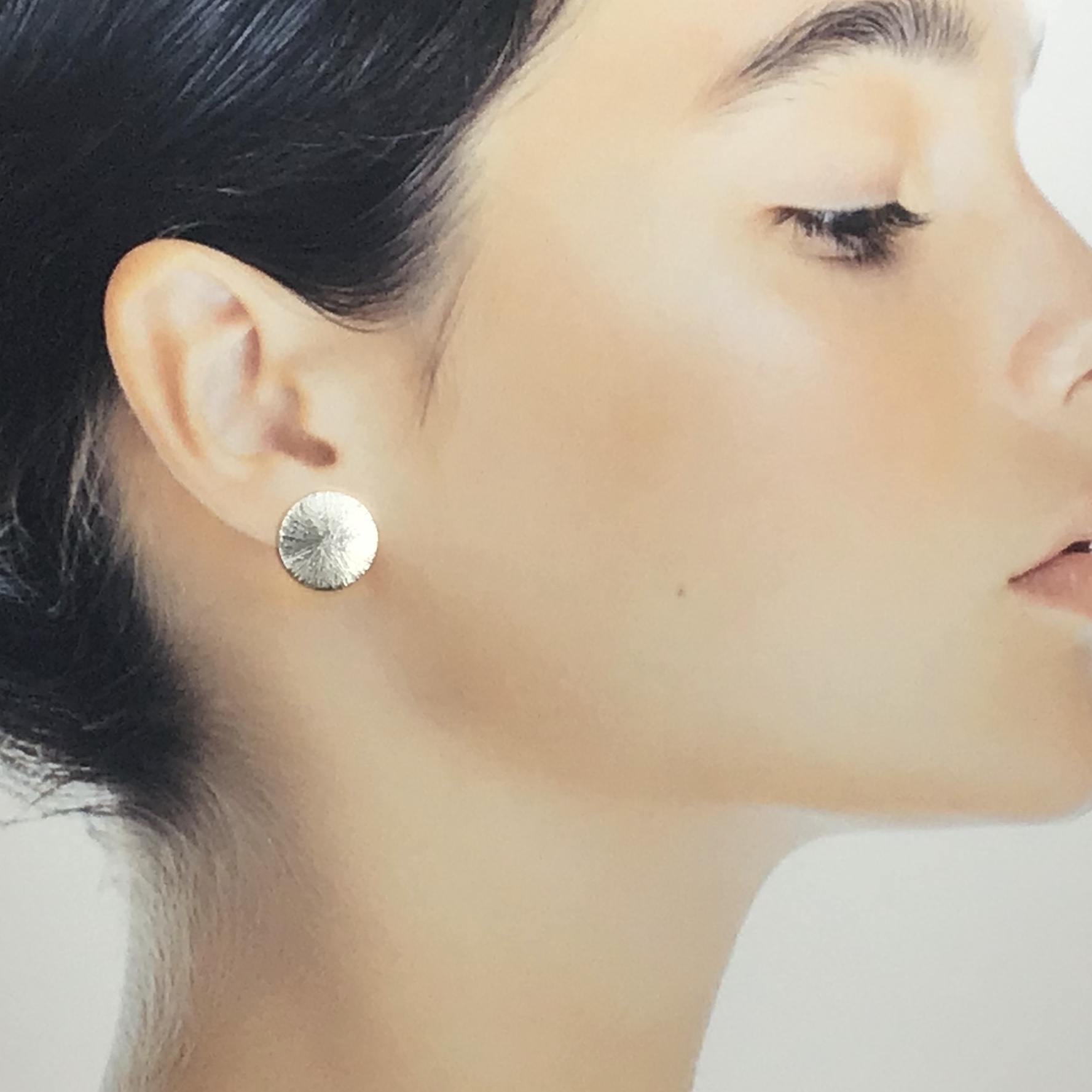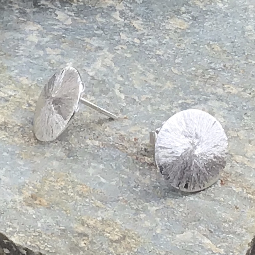 The small etched sun – with a domed profile – same size as the small sun dangle earrings – but these earrings are on an Argentium silver post.