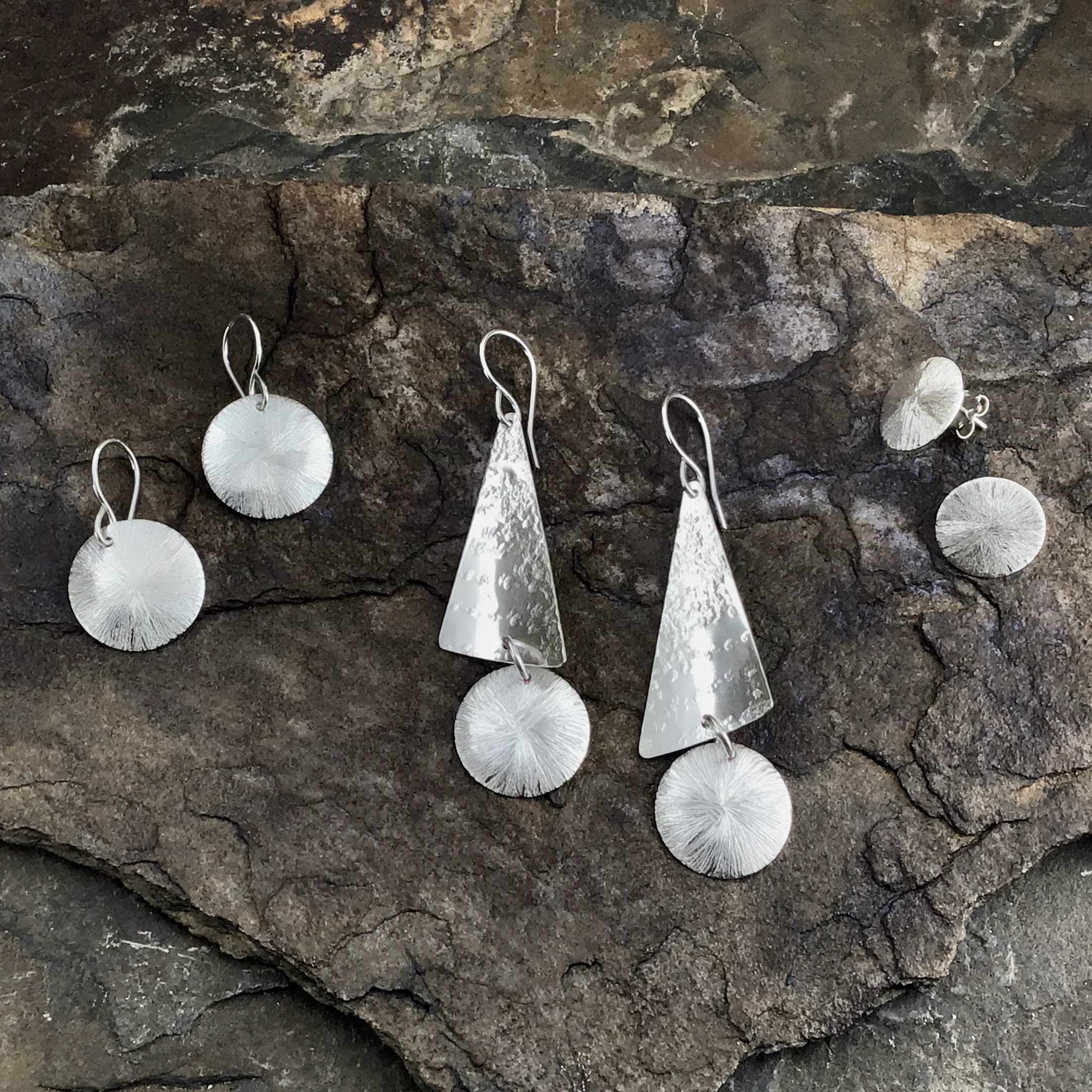 These are the post earring version. I use the same sun – I cut a 1.3 cm disc that I hand etch with the rays of the sun, dome it for extra sparkle and interest.  I solder on an Argentium silver post and add an Argentium butterfly.