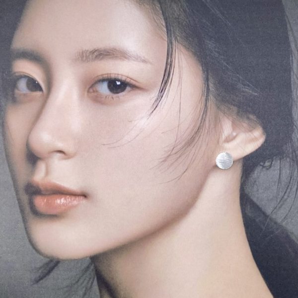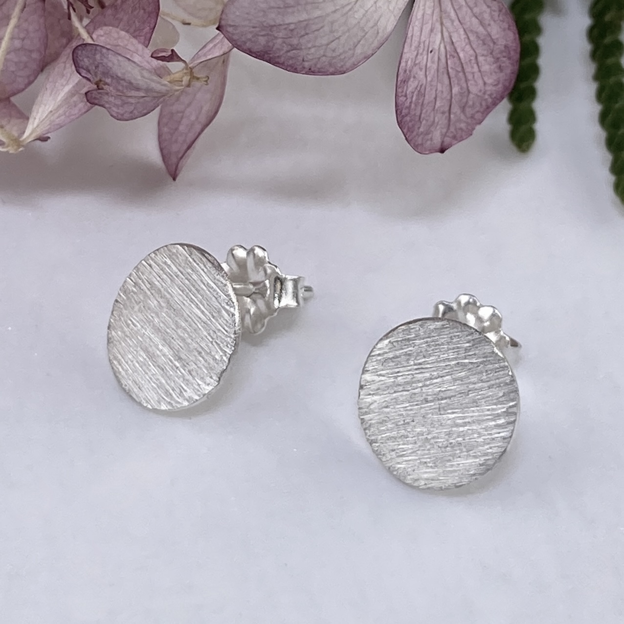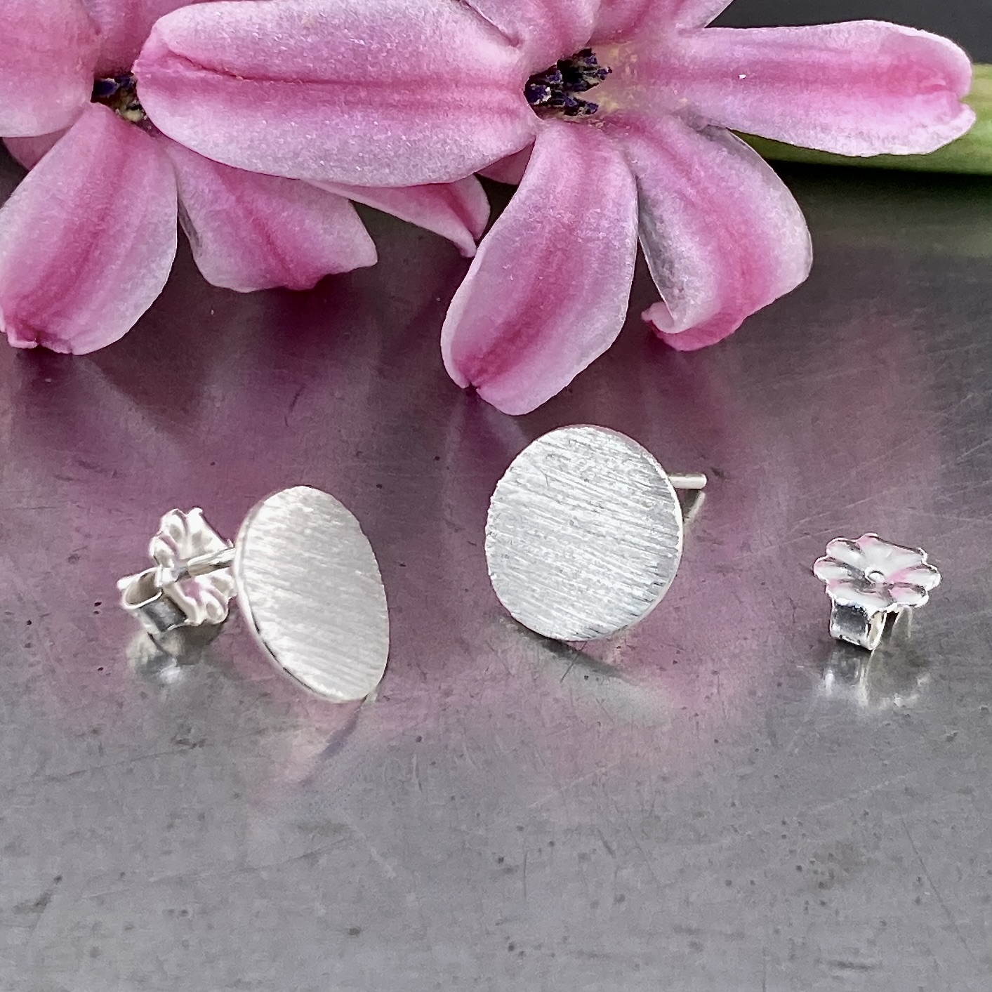 sun with linear etching – post earring.  Argentium silver