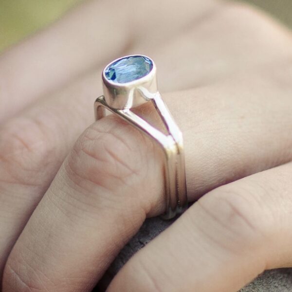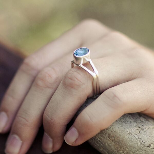 Each Book Ring is hand-fabricated in Argentium silver — cut, shaped, and fused to achieve precise angles and a clean, sculptural form. After forming, I heat-treat the metal to activate the germanium layer for durability and brilliance. The gemstone is bezel-set upright, completing the ring’s distinctive architectural balance.
