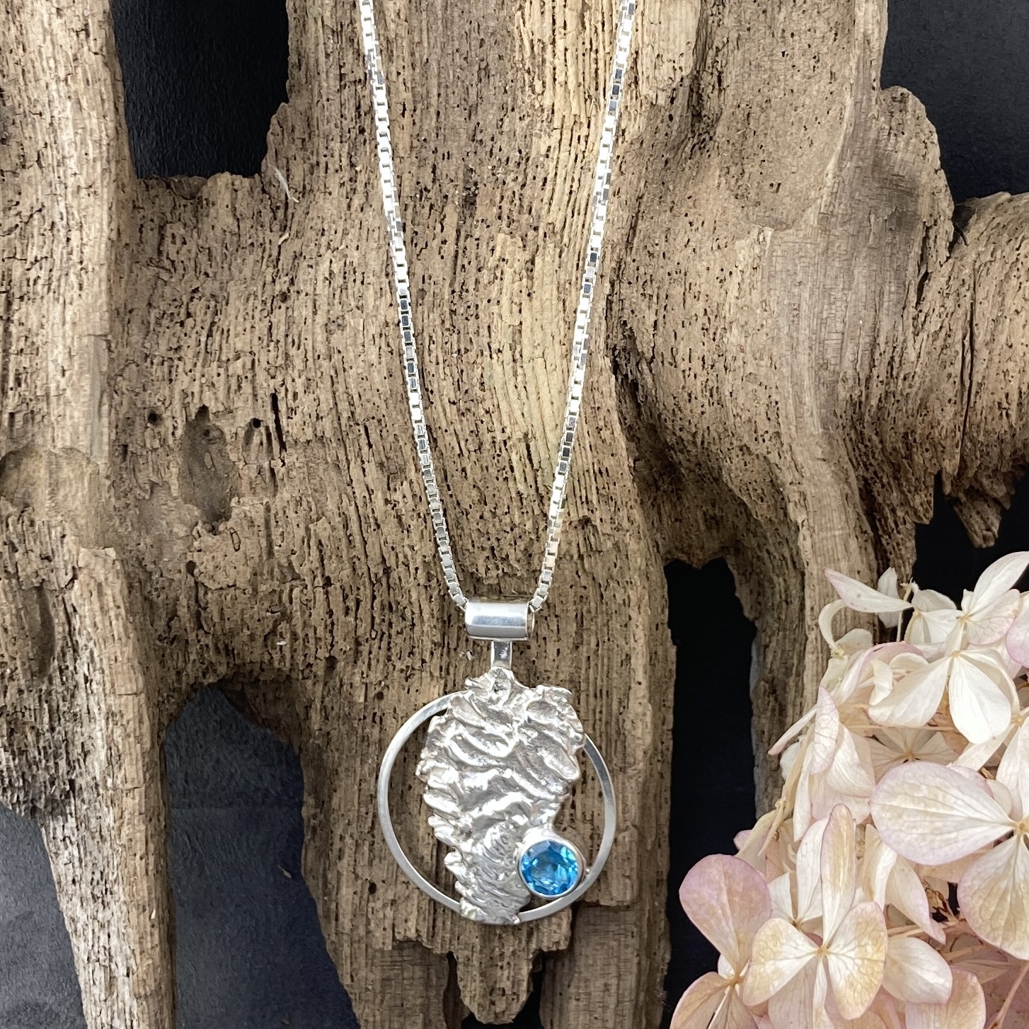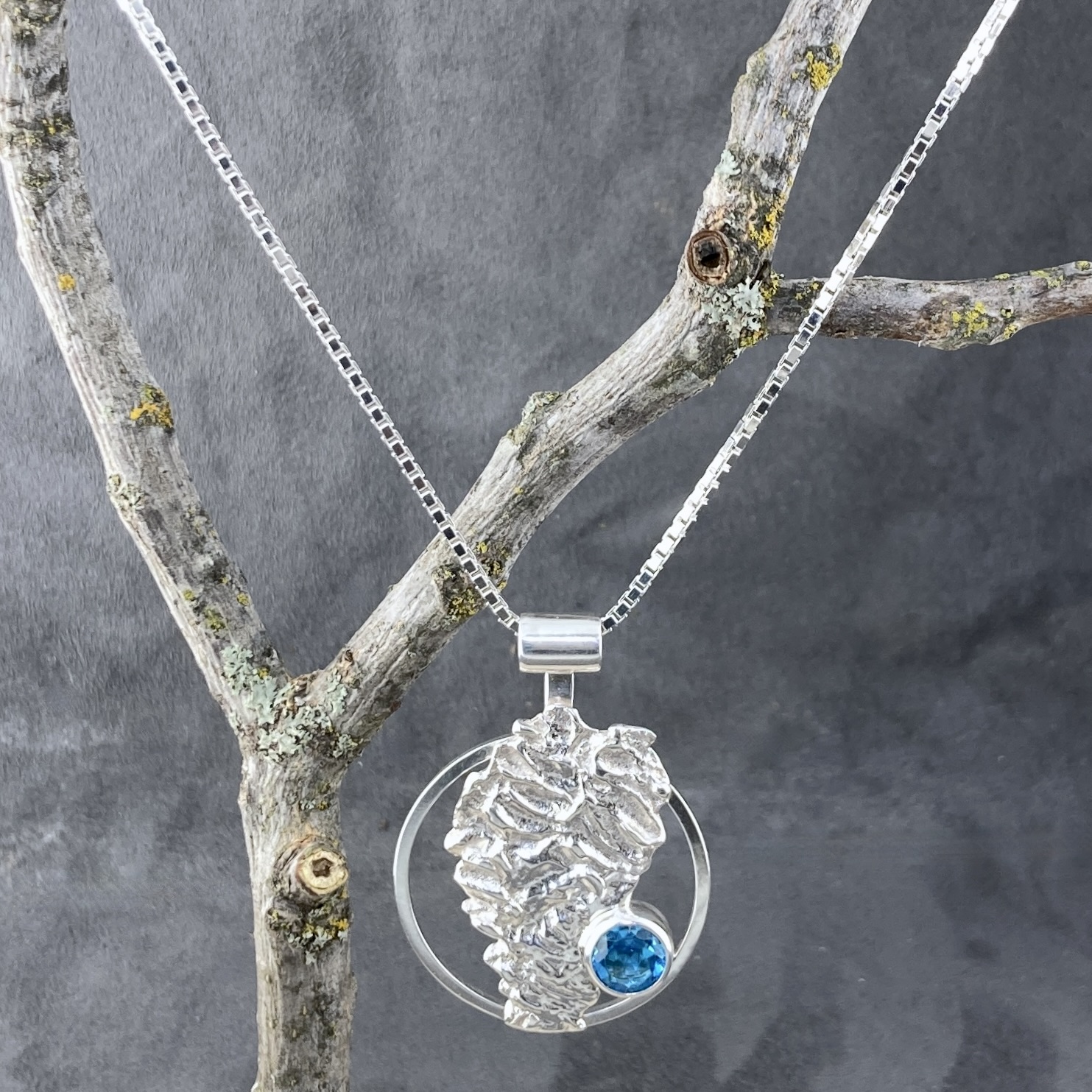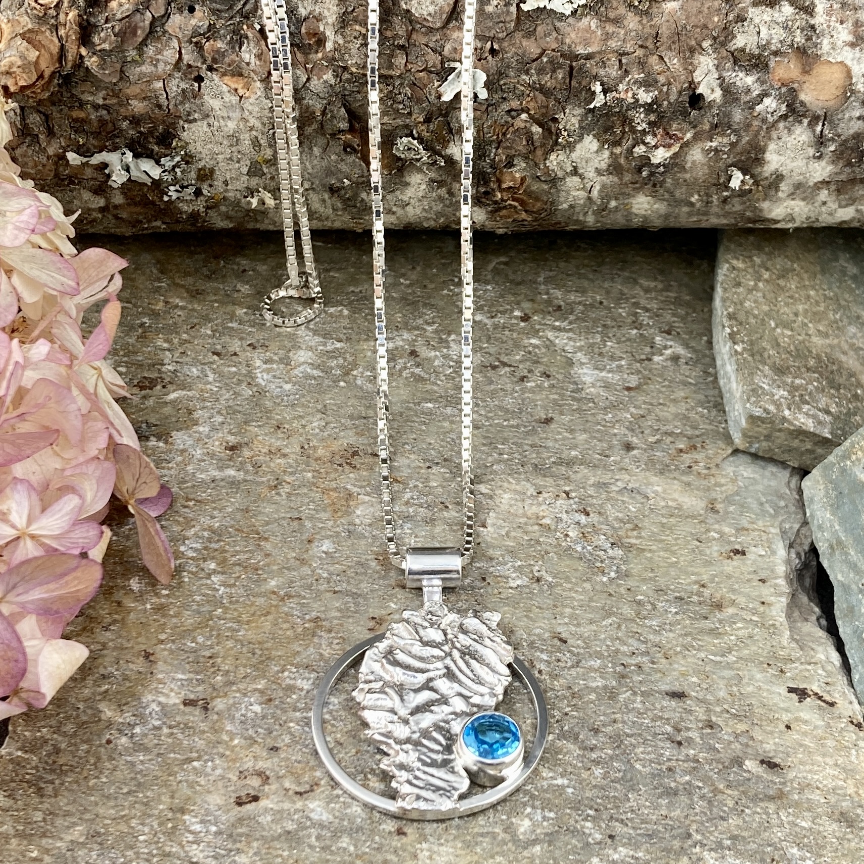 This is the bright blue of the Swiss Blue Topaz, placed on a solid Argentium silver, Lunar textured shard.  I’ve suspended the Lunar shard over the shape of a full moon.  The Swiss Topaz is the brilliant cut – in a 2 carat stone – bezel setting.