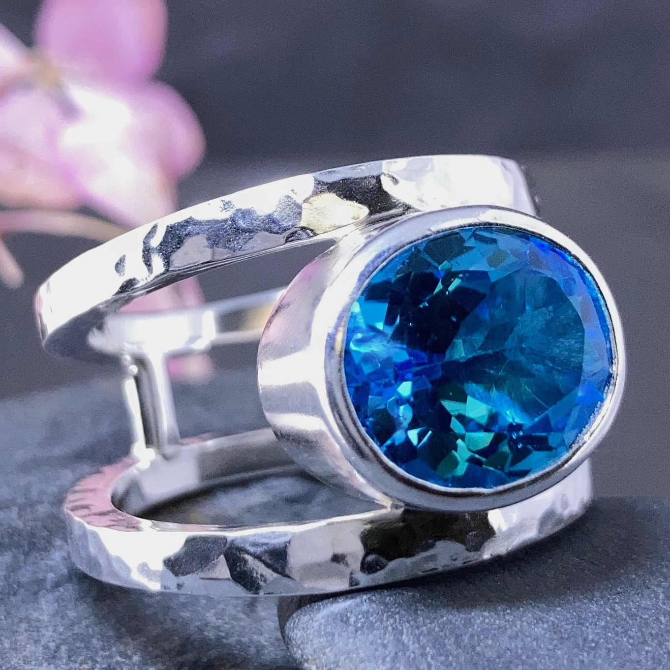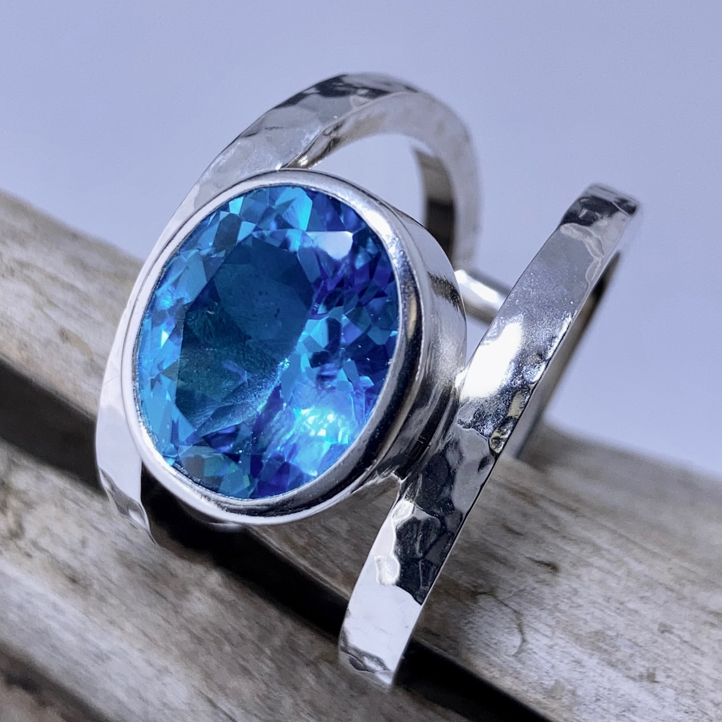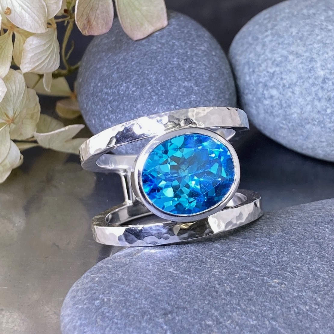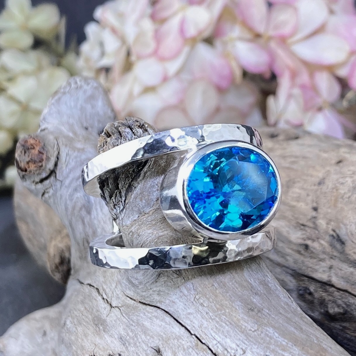 The round double-band might be the most comfortable ring ever! This large oval Swiss blue Topaz is tucked between 2 solid bands of Argentium silver. For this ring design I hammered the surface of the bands flat for added sparkle and a different profile. The ring is wide at the front and narrow at the back to support a large stone, and minimize the band width.