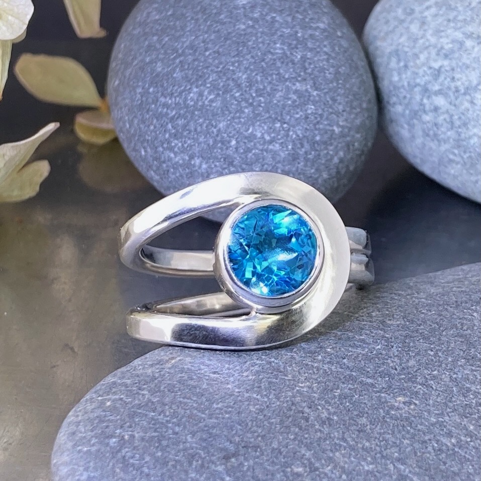The gemstone is a 2.5 carat round Swiss Blue Topaz. Its bright, clear blue adds sparkle and contrast against the white silver. The bezel setting keeps the stone safe and cleanly framed, allowing light to pass through for extra brilliance.