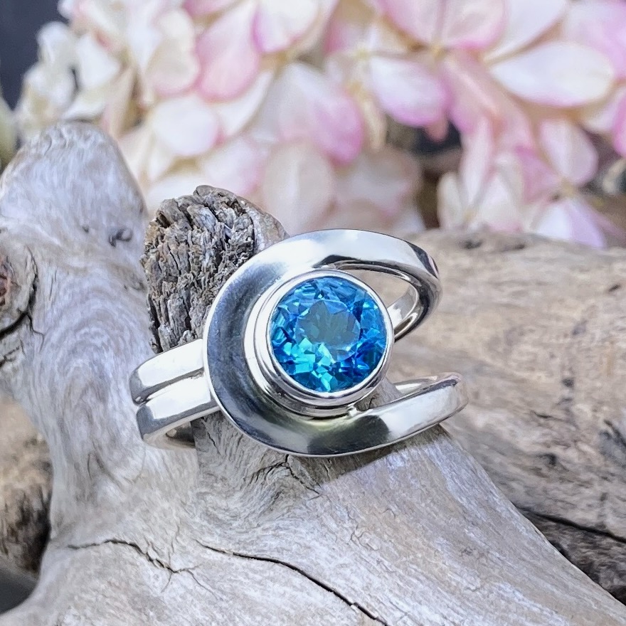 Handmade Swiss Blue Topaz ring in a smooth Buttonhole design with a bright blue round gemstone.