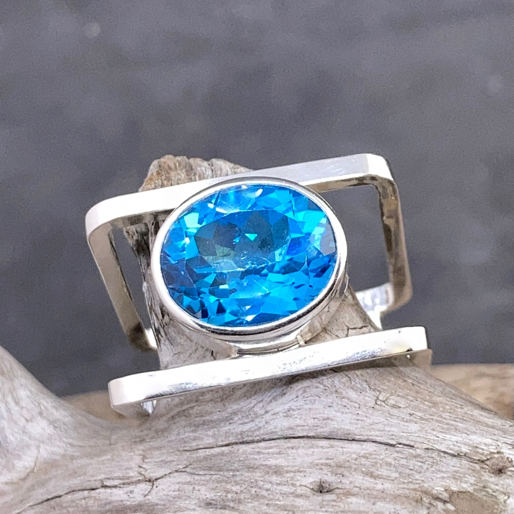 This Swiss Blue Topaz Square Double-Band ring is handcrafted from solid Argentium silver. The band forms a perfect square and is doubled for strength, with a small brace at the base that creates a clean split and supports the large gemstone. At its center sits an 8.5 carat oval Swiss Blue Topaz, faceted to reflect crisp light and rich color.