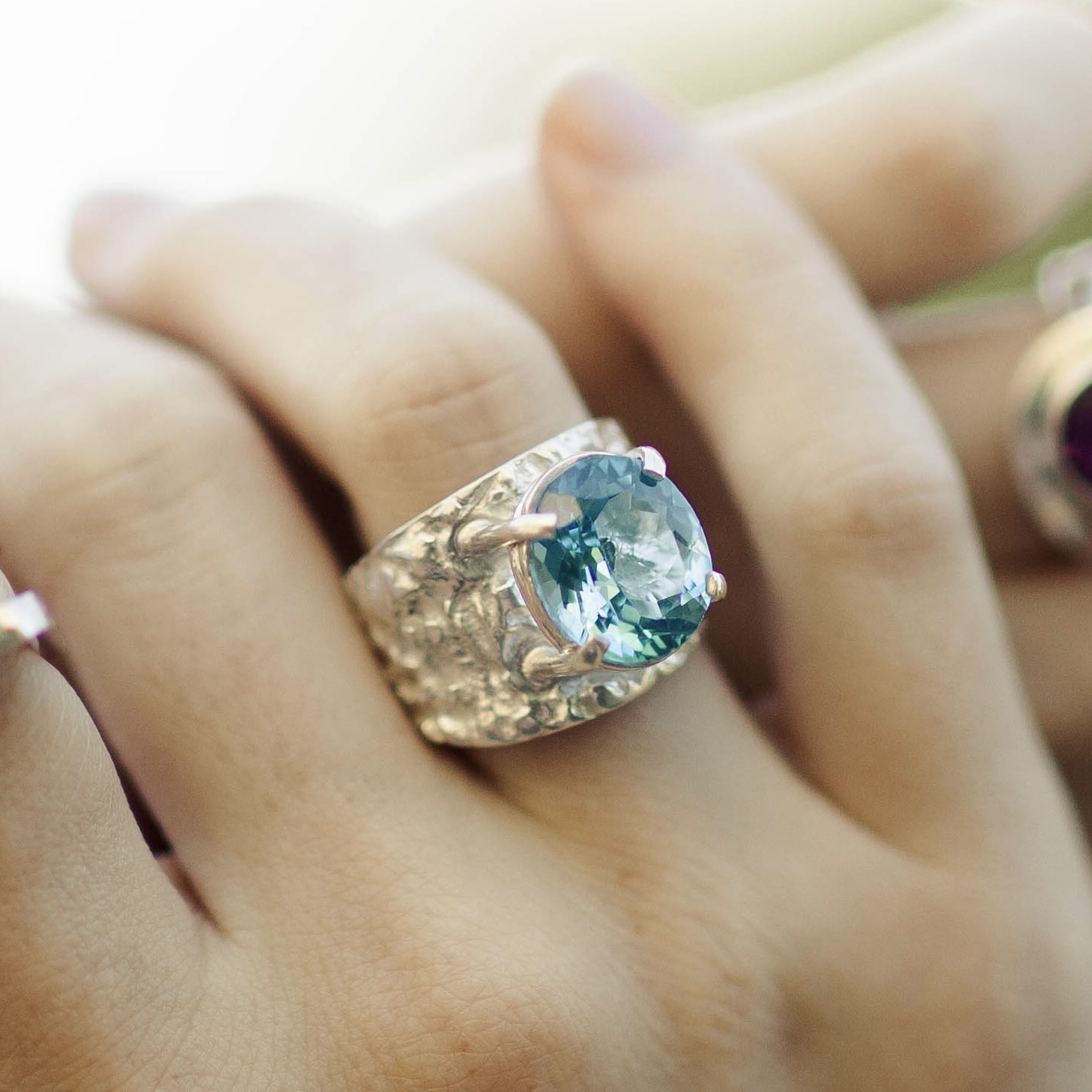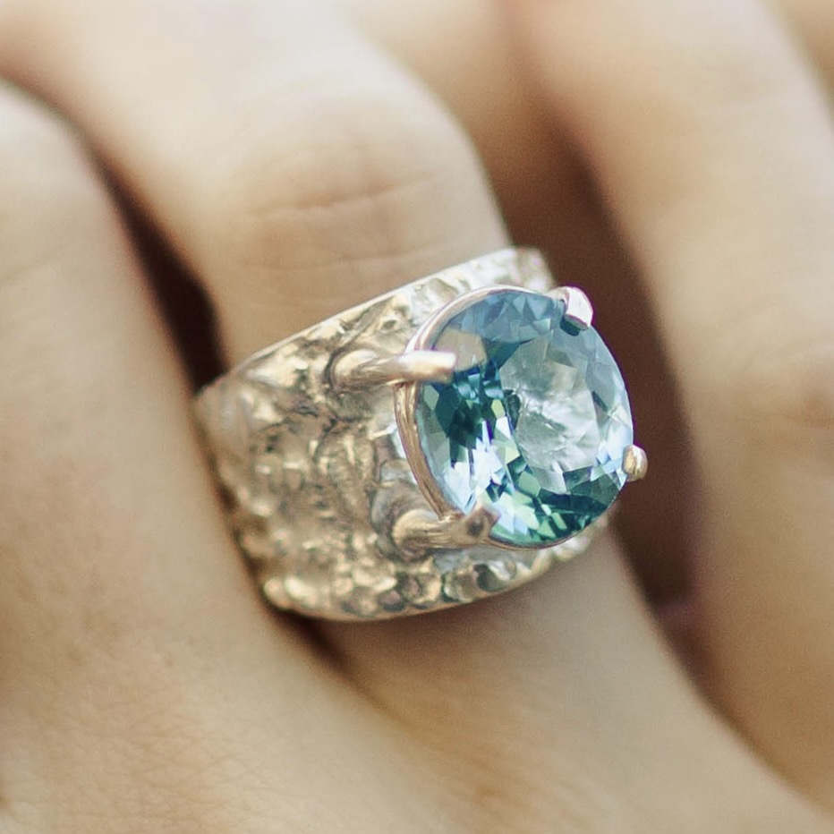 I create the Lunar texture by heating the silver to near-melting, letting it form its own organic landscape. After refining and polishing the inside for comfort, I hand-set the Topaz in open prongs to enhance light and brilliance. The finished ring feels radiant, mysterious, and full of motion — like light on a quiet horizon.