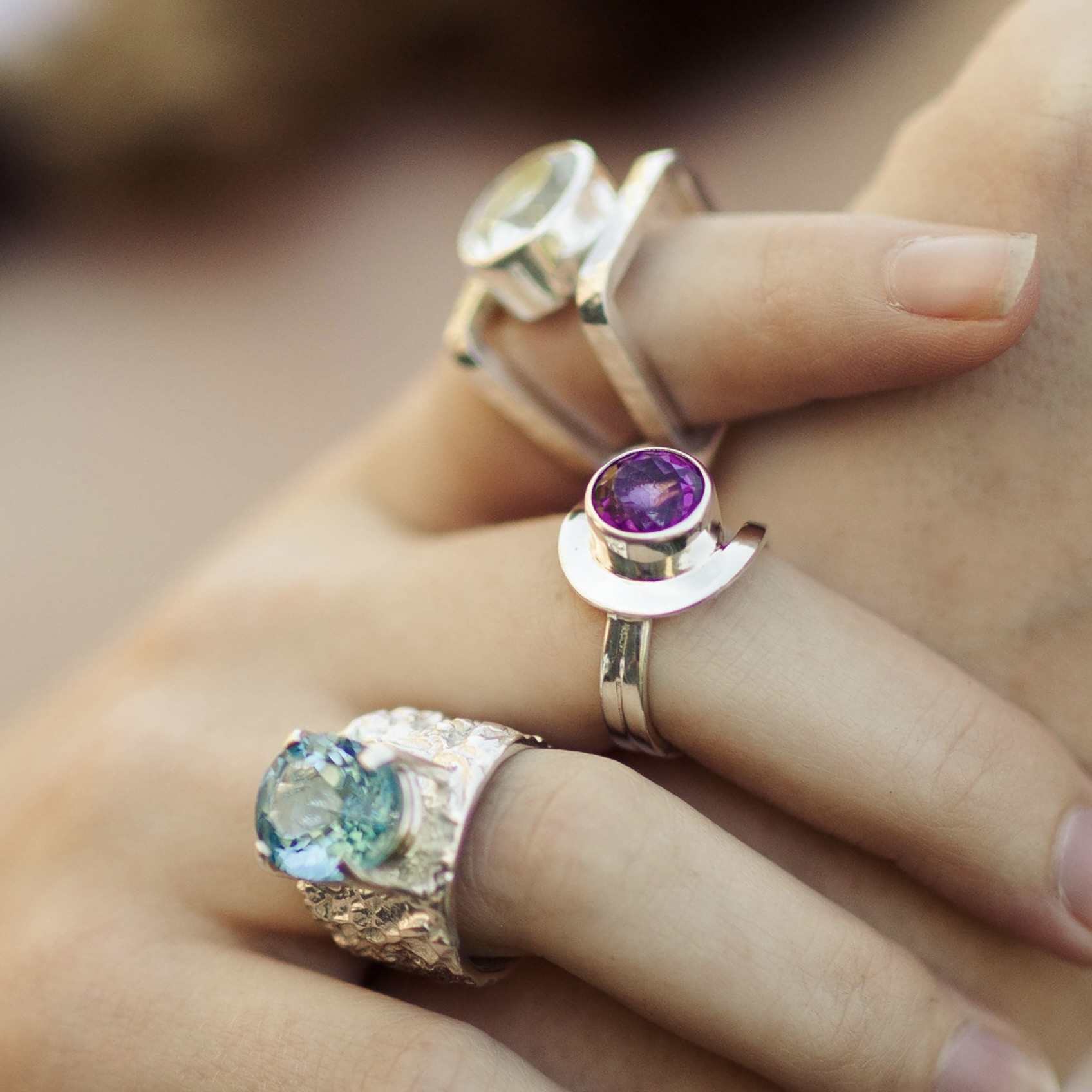 Each Lunar ring is handcrafted in Argentium 940 silver. I melt and work the silver while it’s soft, shaping an uneven, moonlike surface. The texture gives the piece both depth and character. The band feels substantial yet smooth inside, creating a comfortable fit that sits low on the hand.