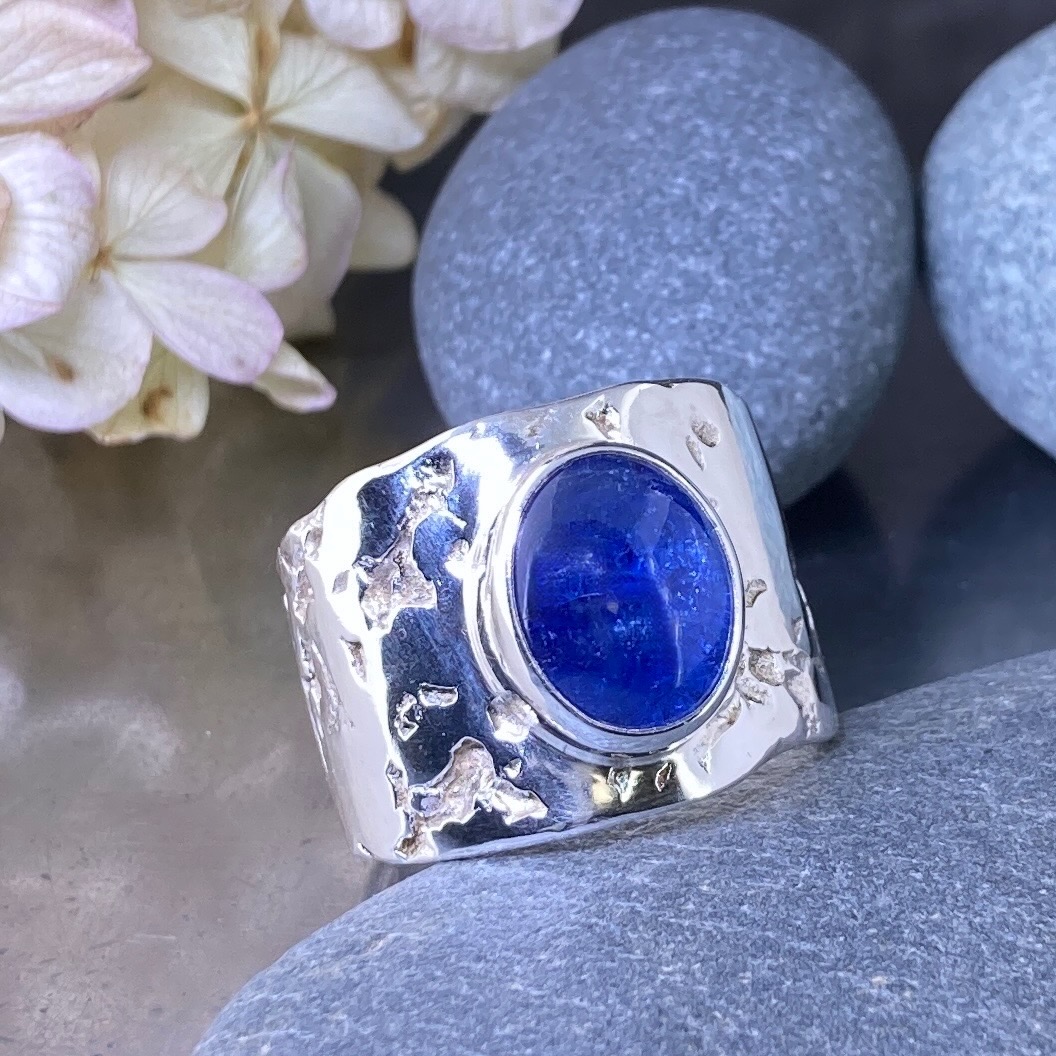 A bold River design ring, shaped with strength and motion in mind. This design begins with molten silver poured into an ingot, then hammered, annealed, and rolled to form a thick, fluid band with organic flow lines that echo water in motion. The centerpiece is an 8-carat oval cabochon Tanzanite in a solid bezel setting, adding deep violet-blue tones to the smooth silver surface.