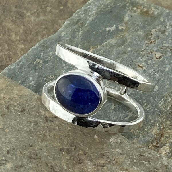 The gemstone is a natural 4 carat cabochon Tanzanite, set in a smooth oval bezel. Its colour shifts from soft violet to deep blue depending on the light. The polished cabochon cut draws the eye inward, contrasting beautifully with the textured silver.
