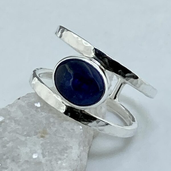 I begin with two separate silver bands, hammering and shaping each by hand. Once formed, I fuse them together to create a unified ring with clean balance. Finally, I set the Tanzanite into a low, protective bezel, finishing the piece with a soft, enduring shine.