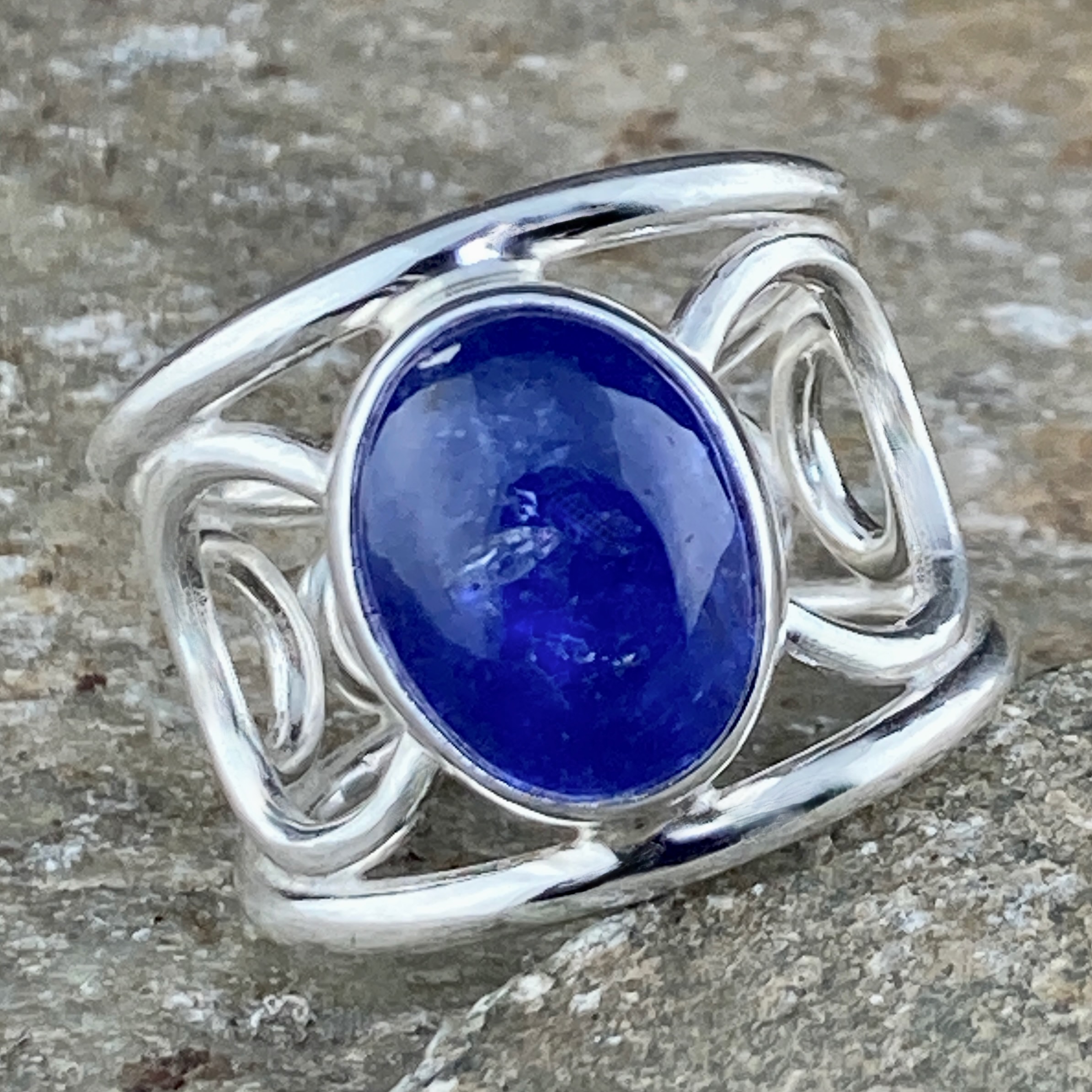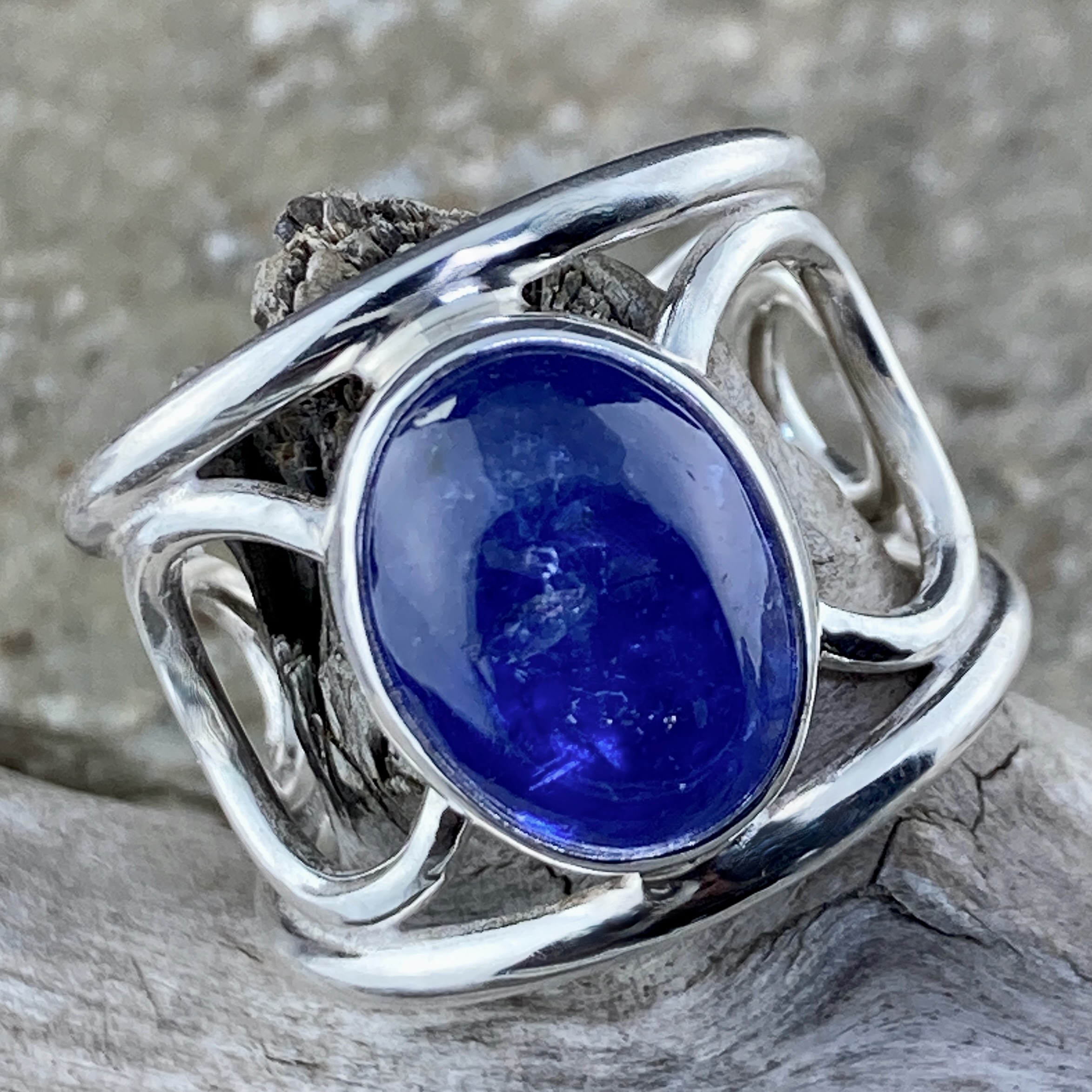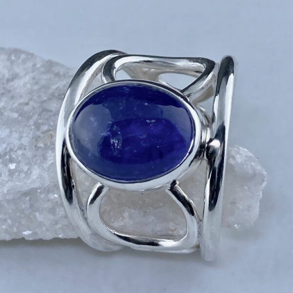 This cabochon-cut Tanzanite weighs about 9 carats. Its violet-blue tone changes with the light, showing both depth and clarity. The bezel setting holds it securely, protecting its edges while keeping the surface smooth. The gem’s cool colour contrasts beautifully with the bright silver, creating a calm but striking balance.