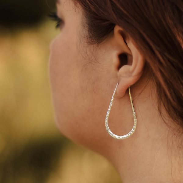 Solid Argentium silver that I hammered, bent into shape, and then hammered some more, until I had the perfect teardrop shaped hoop.  An Argentium ear wire is soldered to the hoop to make the earring close to itself.